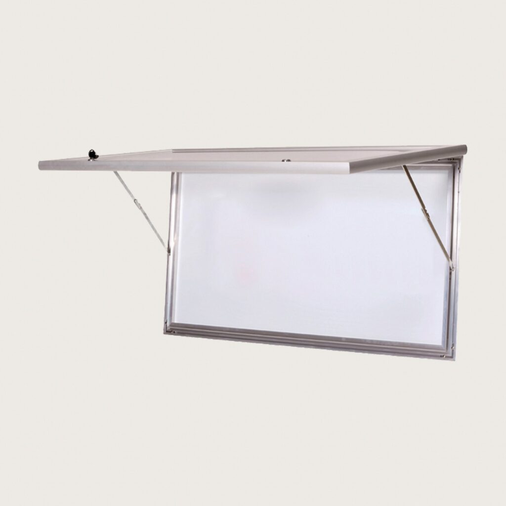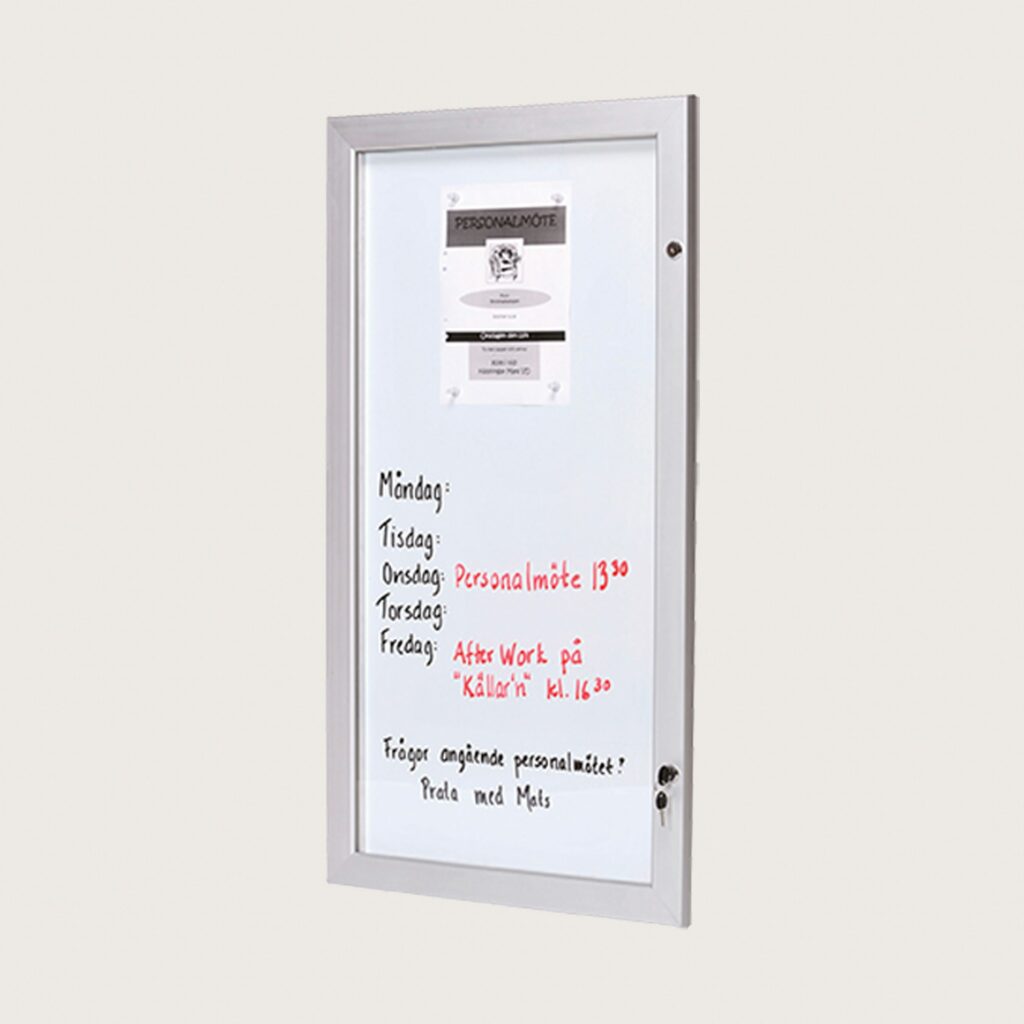 Vid byte av motiv så håller vikbara stag dörren uppe. Går att monteras stående eller liggande och fungerar både utomhus och inomhus. Den går även att använda som whiteboardtavla. Ryggen på skåpet har måttet 108 x 59 cm och på det får det plats sex stycken A4-ark.
