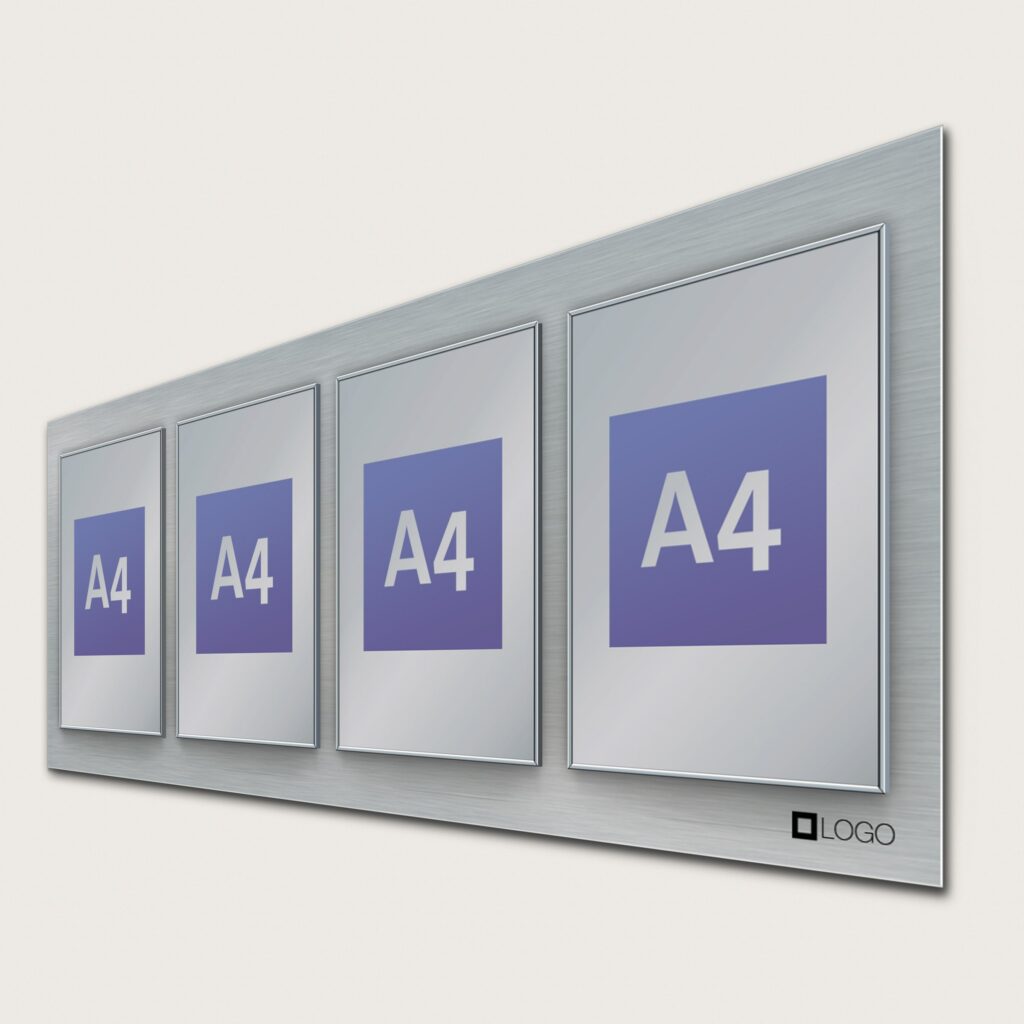 En anslagstavla i aluminium med fyra st A4-Skyltramar på. Är vanligt förekommande i entrén på en fastighet där man enkelt kan informera de som rör sig i byggnaden. Det kan vara hyresgästers- eller företagsnamn, ordningsregler eller kontaktuppgifter till fastighetsskötaren. Här finns möjlighet att bifoga sin logga som då placeras längst ner till höger på anslagstavlan. Om ni inte önskar att ha er logga där så kommer vi lämna platsen tom.