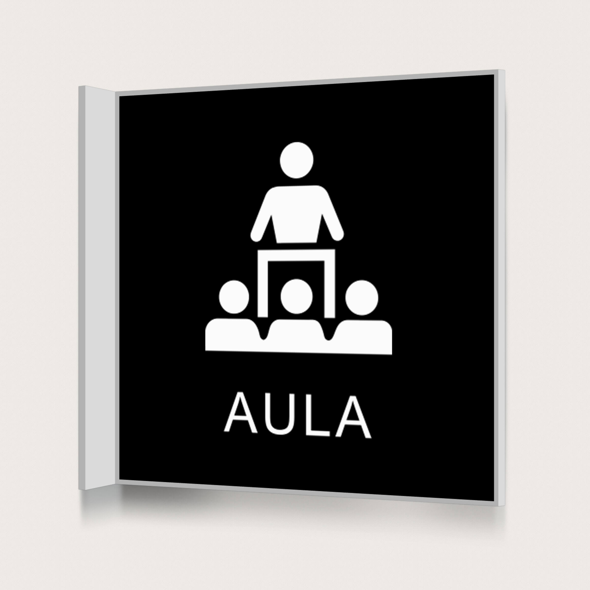 En flaggskylt med texten Aula, som går att beställa i ett flertal färger