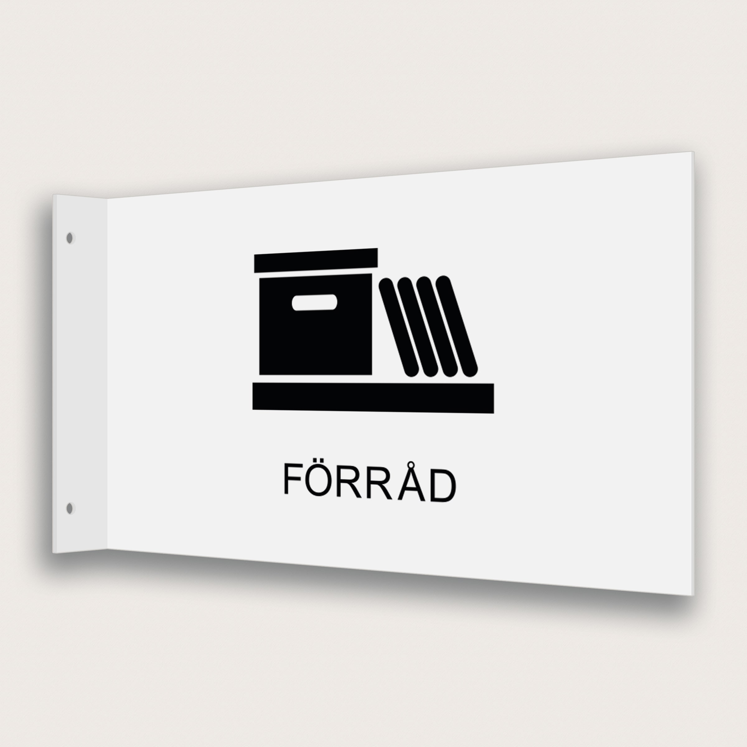 Våra flaggskyltar i storlek 295 x 180 mm används främst då man vill synliggöra ett rum på längre avstånd. Skyltarna tillverkas i aluminium som pulverlackeras i vitt, svart eller grått för att sedan fästa utskurna symboler och text i folie på båda sidorna. Detta innebär att det går att ändra text och symbol vid en eventuell omlokalisering. Flaggskylten Förråd är en bra skylt att sätta upp utanför ett förrå så att det blir lätt för alla att hitta.. Tack vara att skylten har formen av en flagga och sticker ut från väggen så är den lätt att upptäcka från olika håll. Flaggskylten är lätt att montera upp. Med hjälp av dubbelhäftande tejp, skruv och plugg så sitter den stadigt på väggen.