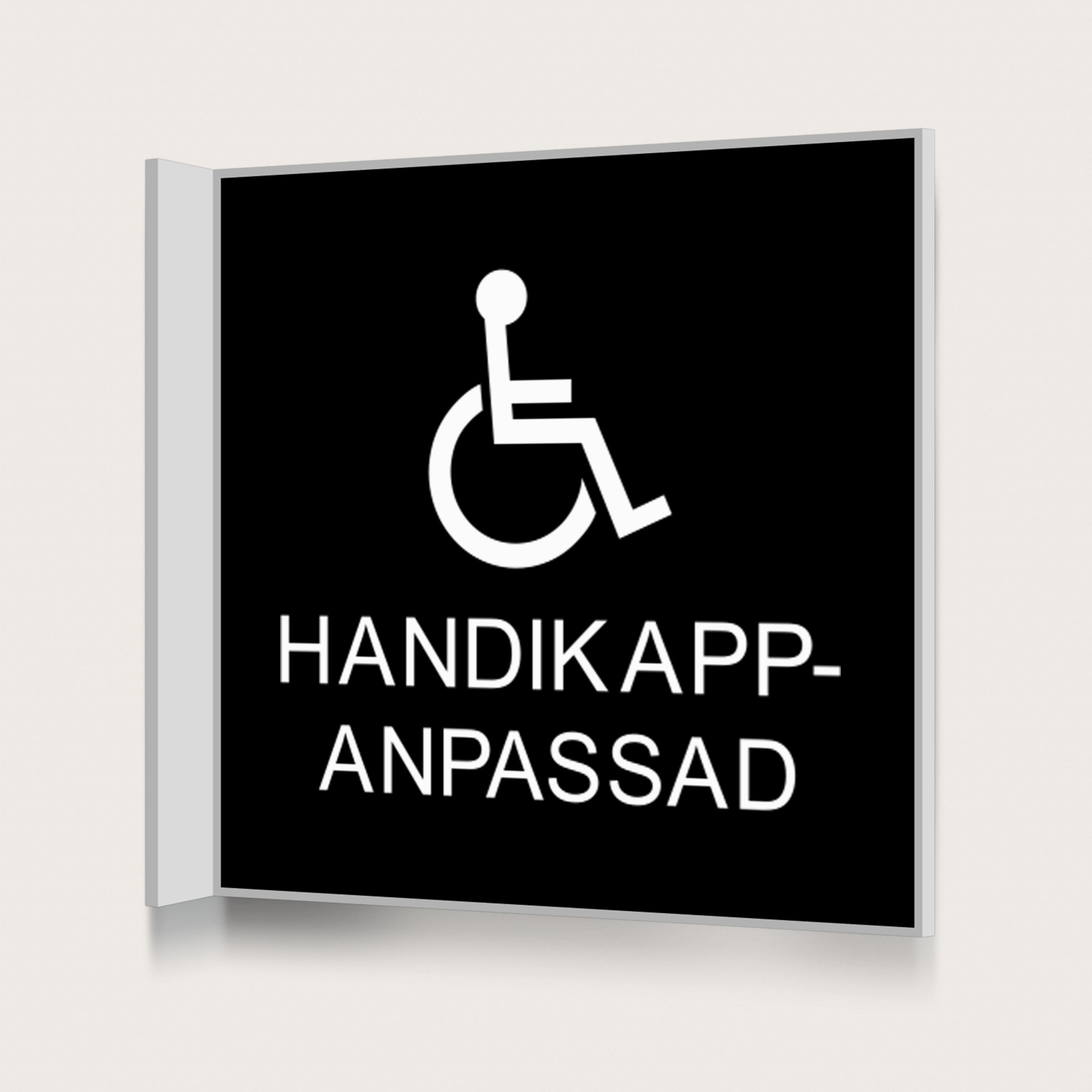 En flaggskylt i storlek 150 x 150 mm med en rullstolssymbol och texten Handikappsanpassad.