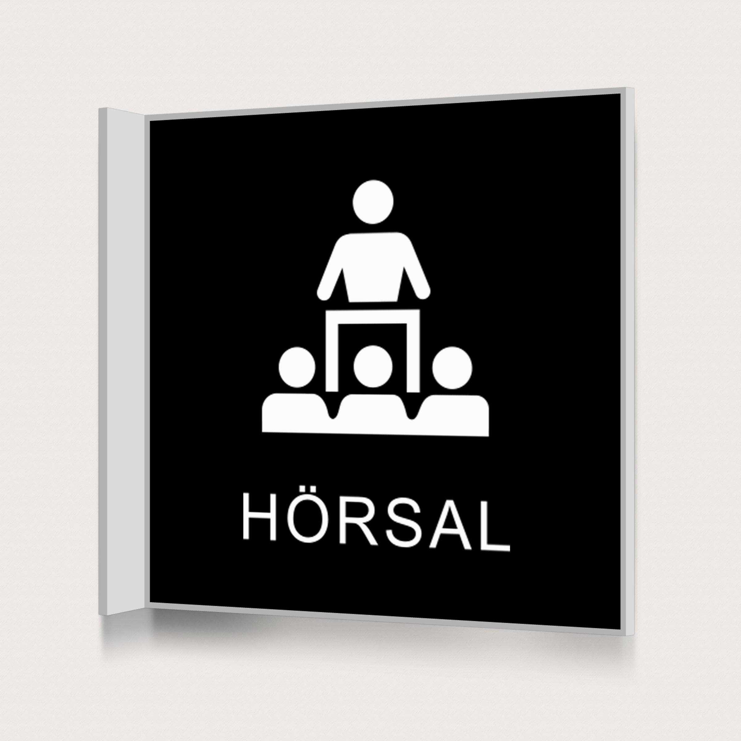 En flaggskylt med text och symbol att sätta vid en hörsal.