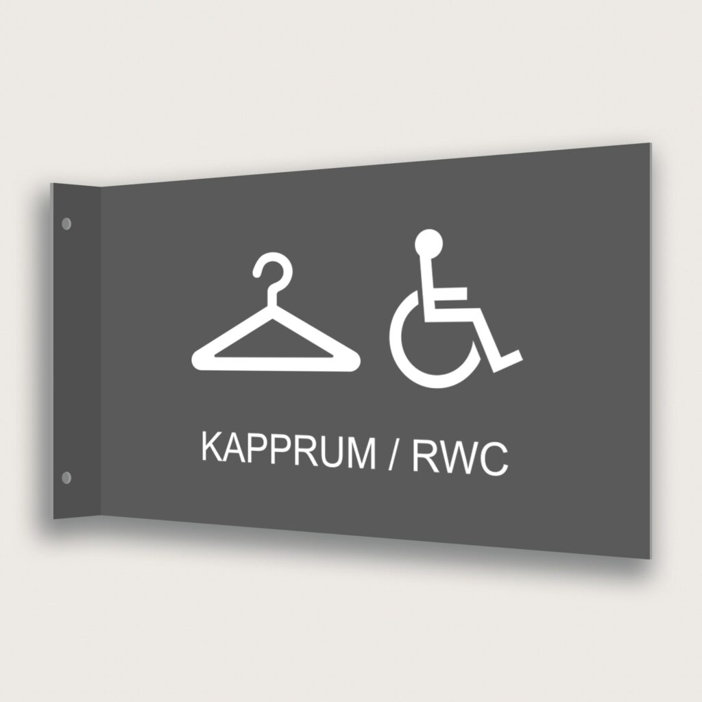 Skyltarna tillverkas i aluminium som pulverlackeras i vitt, svart eller grått för att sedan fästa utskurna symboler och text  i folie på båda sidorna. Detta innebär att det går att ändra text och symbol vid en eventuell omlokalisering. Flaggskylten Kapprum / RWC är ett bra sätt att märka upp så att man lätt hittar. Tack vara att skylten har formen av en flagga och sticker ut från väggen så är den lätt att upptäcka från olika håll. Flaggskylten är lätt att montera upp. Med hjälp av dubbelhäftande tejp, skruv och plugg så sitter den stadigt på väggen.