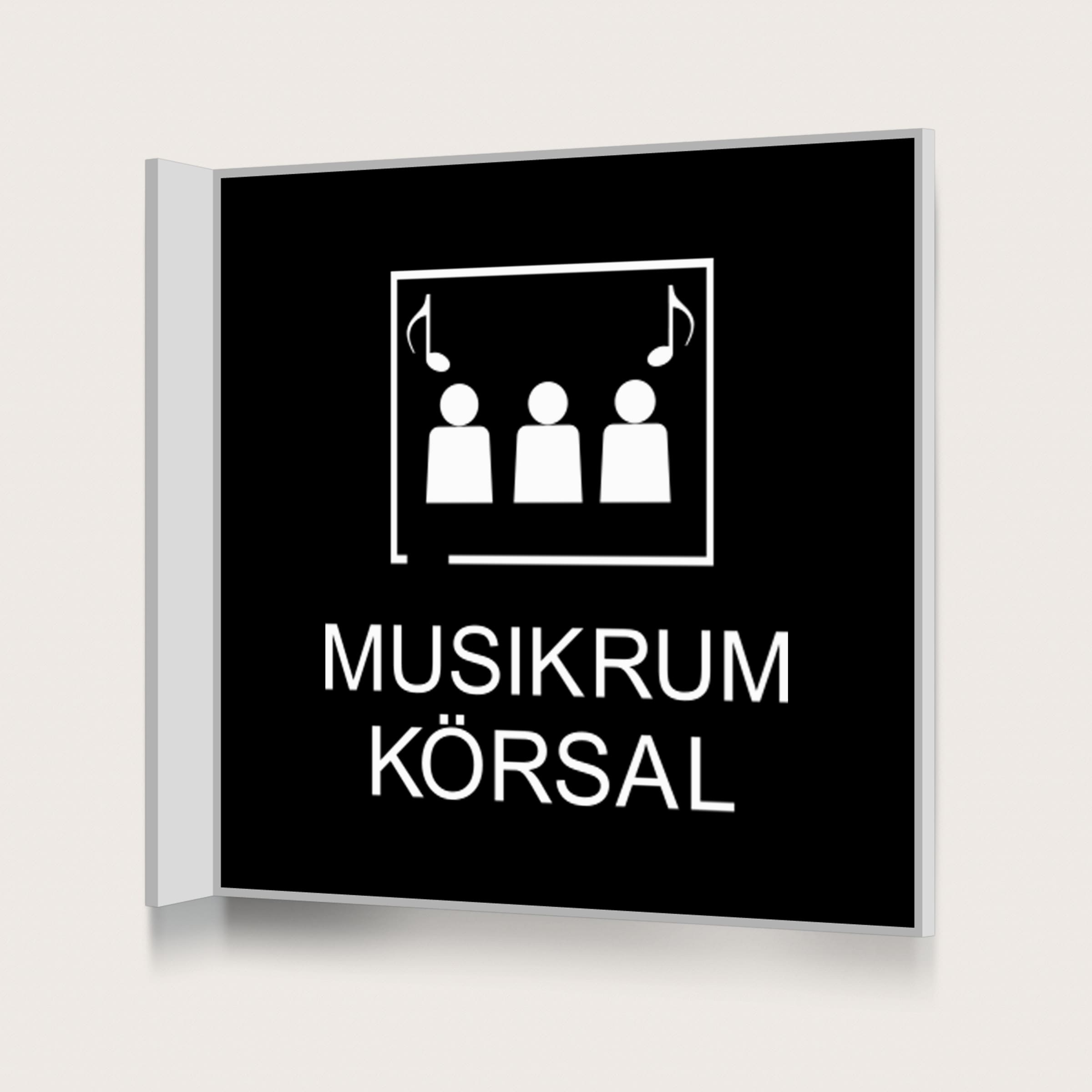 En flaggskylt för Musikrum och Körsal som är lätt att upptäcka från två håll.