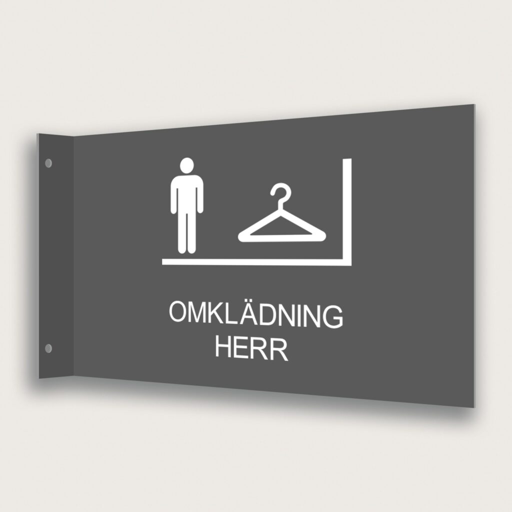 Våra flaggskyltar i storlek 295 x 180 mm används främst då man vill synliggöra ett rum på längre avstånd. Skyltarna tillverkas i aluminium som pulverlackeras i vitt, svart eller grått för att sedan fästa utskurna symboler och text i folie på båda sidorna. Detta innebär att det går att ändra text och symbol vid en eventuell omlokalisering. Flaggskylten Omklädning Herr är ett bra sätt att märka upp så att man lätt hittar. Tack vara att skylten har formen av en flagga och sticker ut från väggen så är den lätt att upptäcka från olika håll. Flaggskylten är lätt att montera upp. Med hjälp av dubbelhäftande tejp, skruv och plugg så sitter den stadigt på väggen.