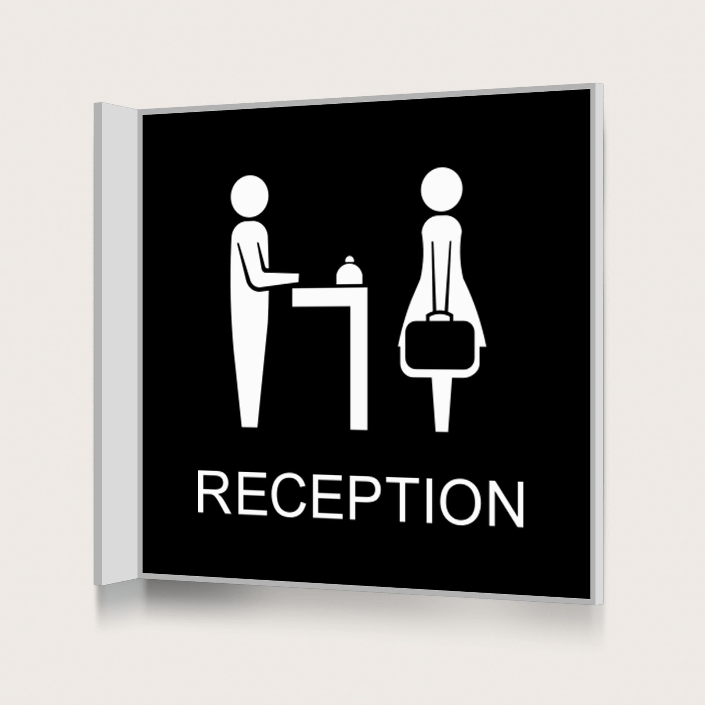 Vår flaggskylt för Reception är en tydlig receptionskylt att sätta upp i t. ex ett hotell.
