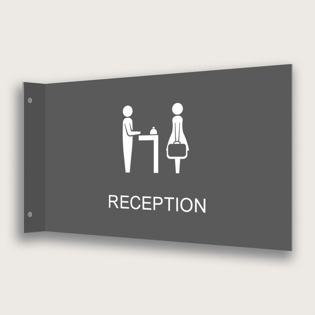 Våra flaggskyltar i storlek 295 x 180 mm används främst då man vill synliggöra ett rum på längre avstånd. Skyltarna tillverkas i aluminium som pulverlackeras i vitt, svart eller grått för att sedan fästa utskurna symboler och text i folie på båda sidorna. Detta innebär att det går att ändra text och symbol vid en eventuell omlokalisering. Flaggskylten Reception är ett bra sätt att märka upp så att man lätt hittar. Tack vara att skylten har formen av en flagga och sticker ut från väggen så är den lätt att upptäcka från olika håll. Flaggskylten är lätt att montera upp. Med hjälp av dubbelhäftande tejp, skruv och plugg så sitter den stadigt på väggen.