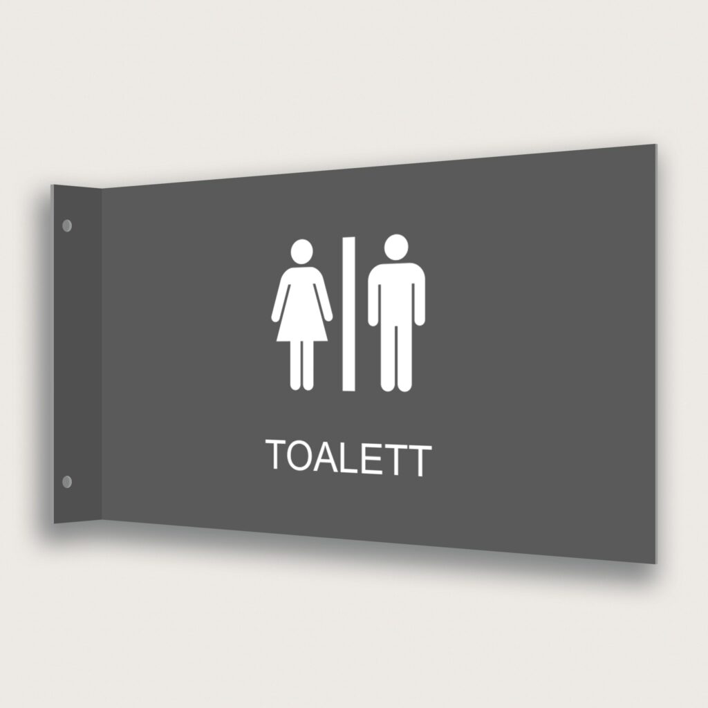 Våra flaggskyltar i storlek 295 x 180 mm används främst då man vill synliggöra ett rum på längre avstånd. Skyltarna tillverkas i aluminium som pulverlackeras i vitt, svart eller grått för att sedan fästa utskurna symboler och text i folie på båda sidorna. Detta innebär att det går att ändra text och symbol vid en eventuell omlokalisering. Flaggskylten Toalett är en bra wc skylt att märka upp så man lätt hittar. Tack vara att skylten har formen av en flagga och sticker ut från väggen så är den lätt att upptäcka från olika håll. Flaggskylten är lätt att montera upp. Med hjälp av dubbelhäftande tejp, skruv och plugg så sitter den stadigt på väggen.