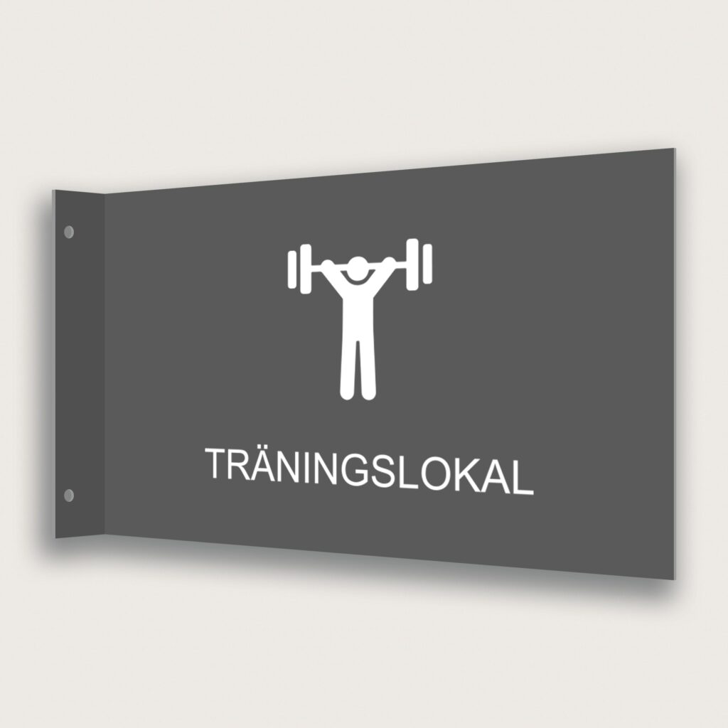 Våra flaggskyltar i storlek 295 x 180 mm används främst då man vill synliggöra ett rum på längre avstånd. Skyltarna tillverkas i aluminium som pulverlackeras i vitt, svart eller grått för att sedan fästa utskurna symboler och text i folie på båda sidorna. Detta innebär att det går att ändra text och symbol vid en eventuell omlokalisering. Flaggskylten för Träningslokal är ett bra sätt att märka upp så man lätt hittar. Tack vara att skylten har formen av en flagga och sticker ut från väggen så är den lätt att upptäcka från olika håll. Flaggskylten är lätt att montera upp. Med hjälp av dubbelhäftande tejp, skruv och plugg så sitter den stadigt på väggen.