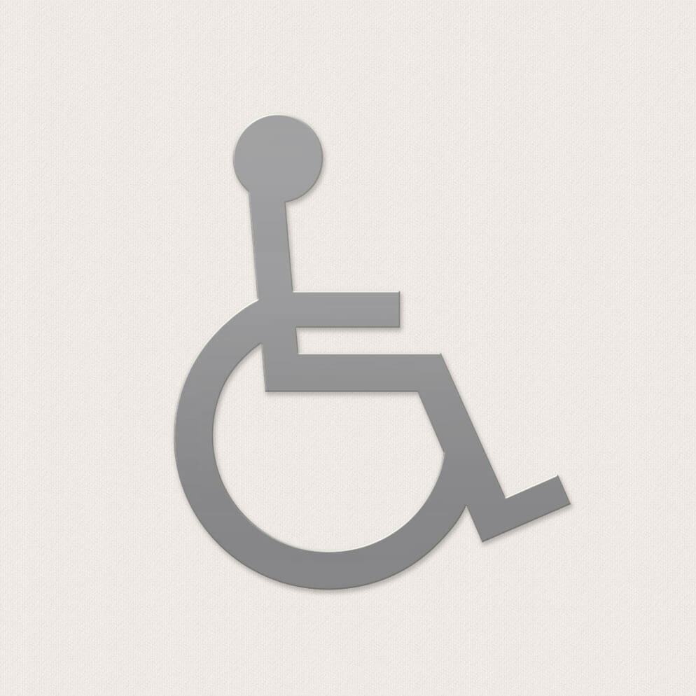 En konturskuren rullstolssymbol i aluminium att pryda dörren till en rullstolsanpassad toalett.