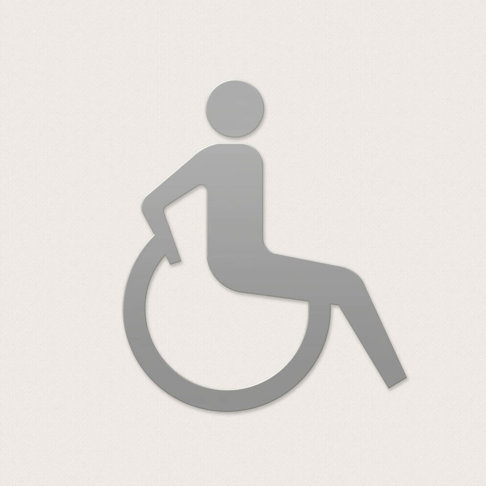 En konturskuren rullstolssymbol i aluminium att pryda dörren till en rullstolsanpassad toalett.