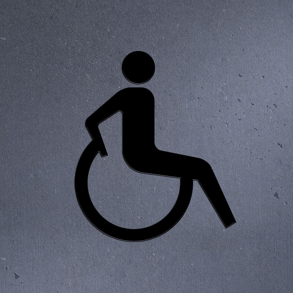 En utskuren rullstolssymbol i plast som markerar upp en rullstolsanpassad toalett.