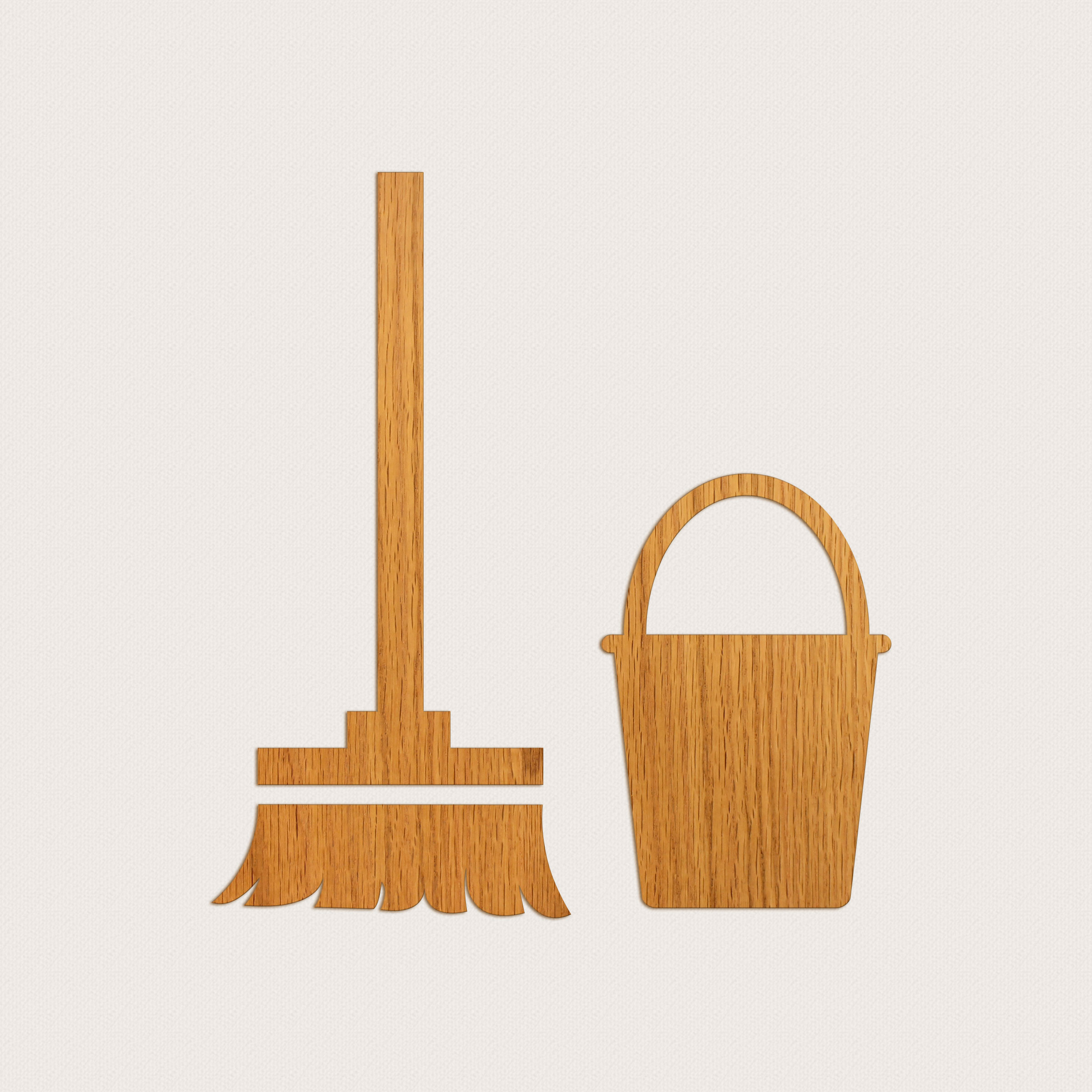 Ett utskuret piktogram i trä för städförråd. Välj mellan symbolhöjd 200 mm och 300 mm.