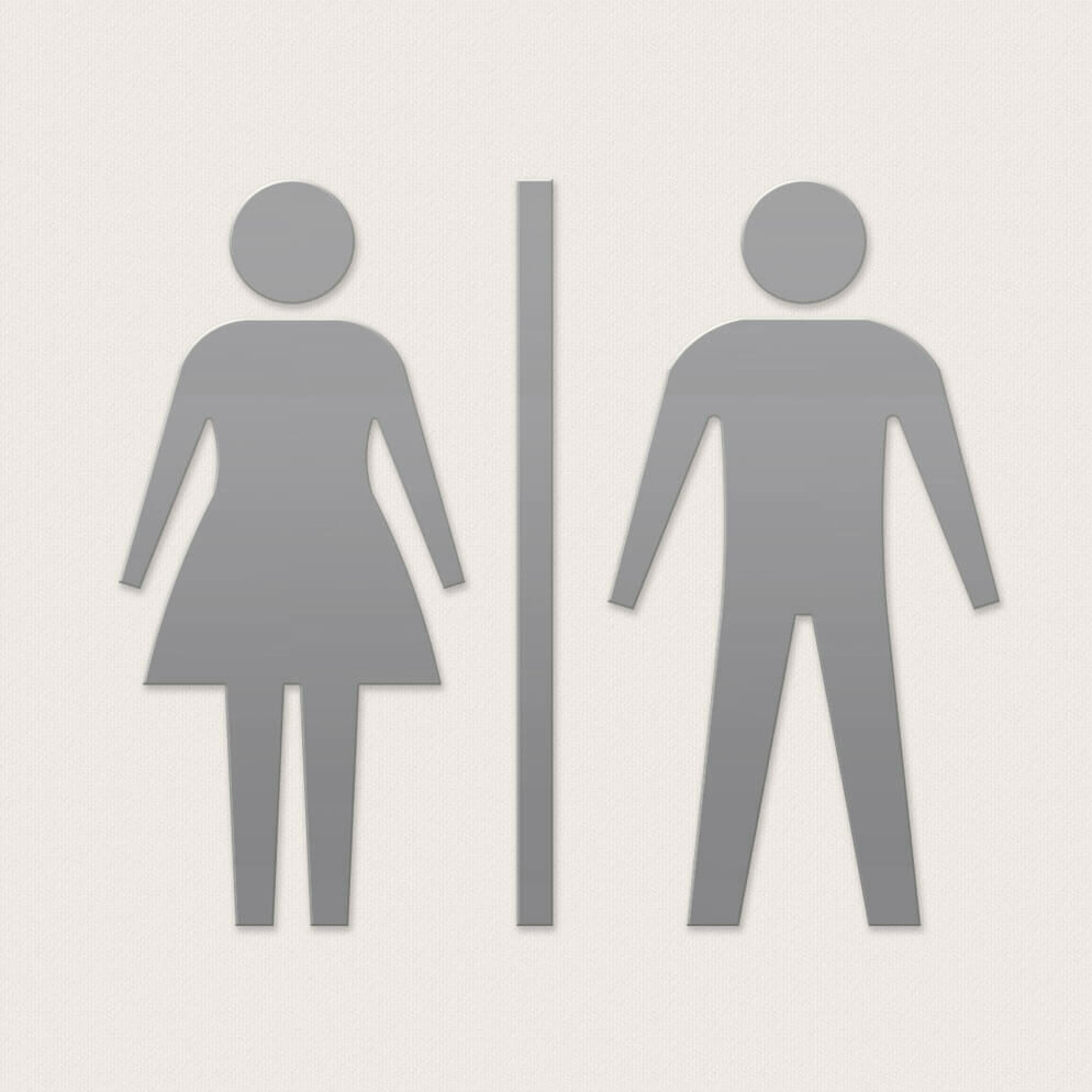 En toalettskylt med utskurna symboler i Aluminium. Välj höjd på symbolerna, 200 mm eller 300 mm.