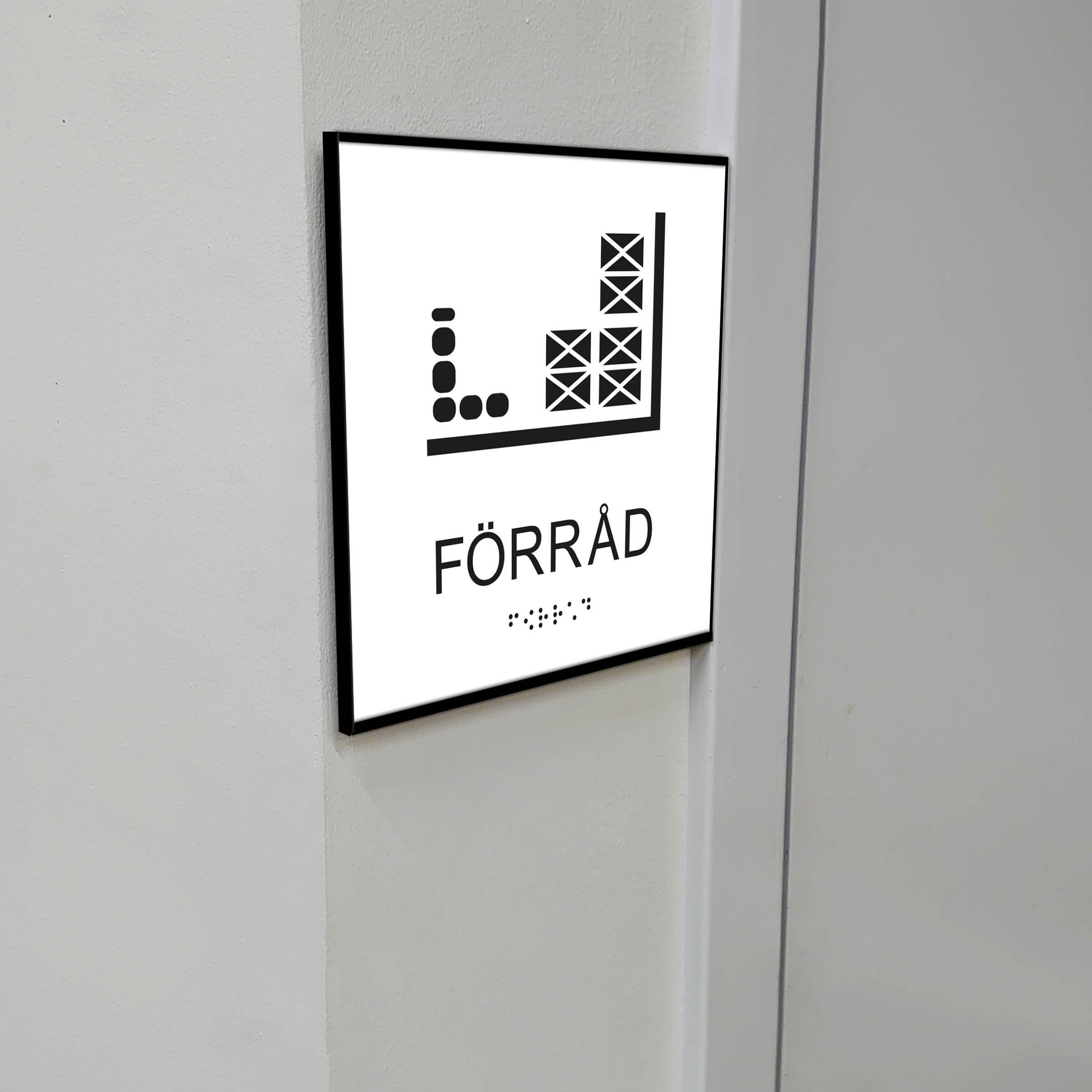 En taktil skylt att sätta utanför ett förråd. Dessa skyltar kan man ha användning för i skolor, lägenhetsbyggnader och sjukhus.