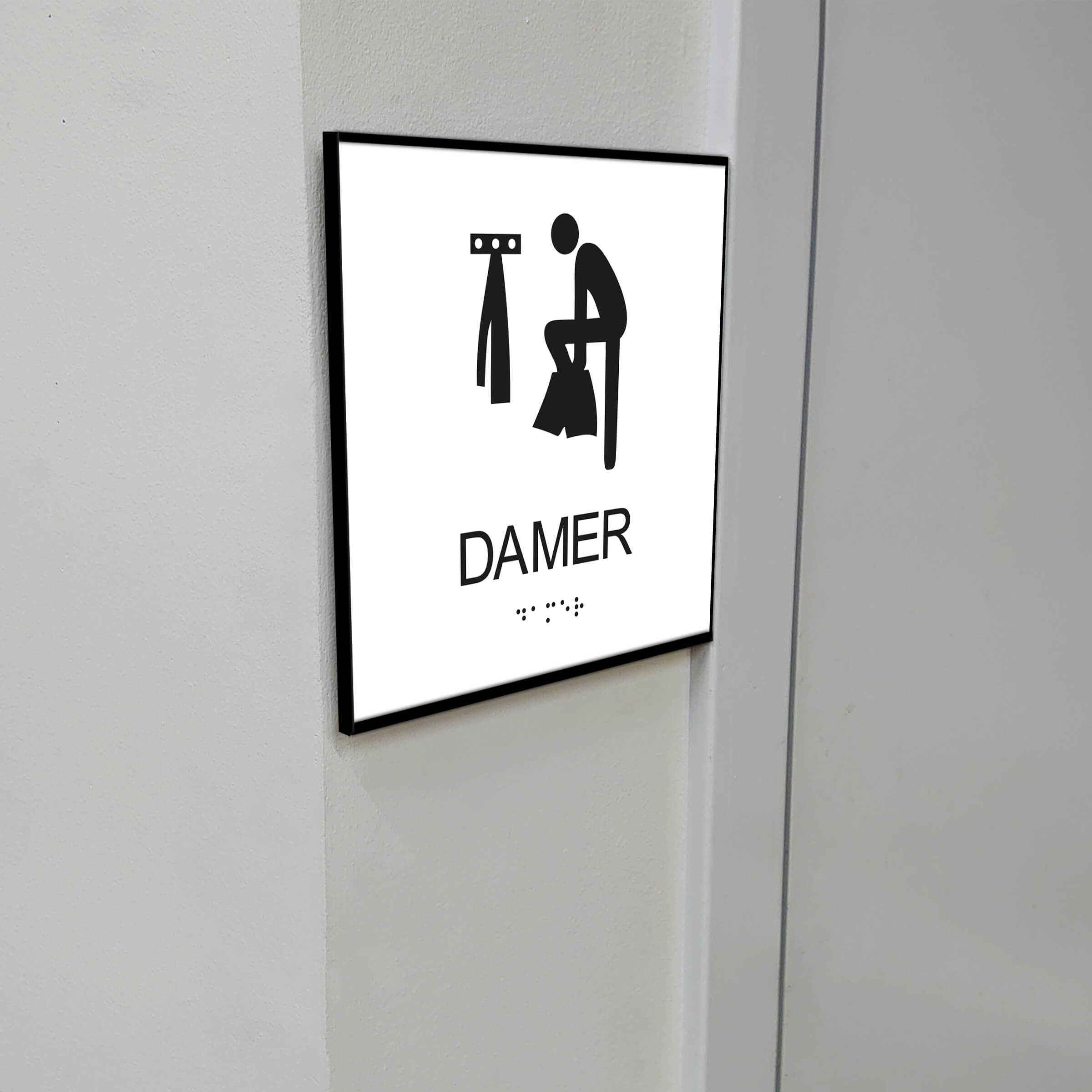 Storlek 150 x 150 mm. Taktilt piktogram Omklädningsrum Damer med ram. Välj mellan olika färger.