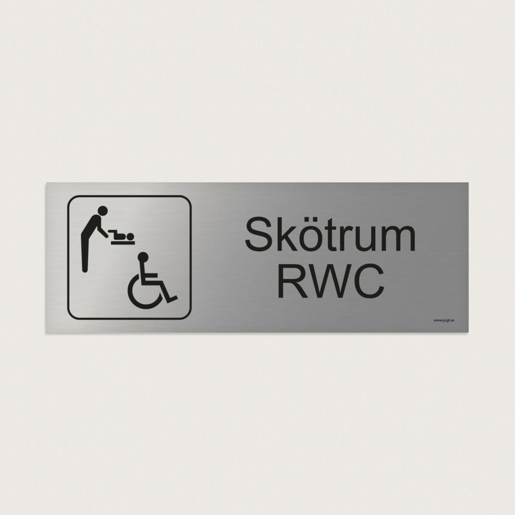 En trivselskylt med symbol och text för skötrum och RWC som visar att denna toalett är rullstolsanpassad och har ett skötrum.