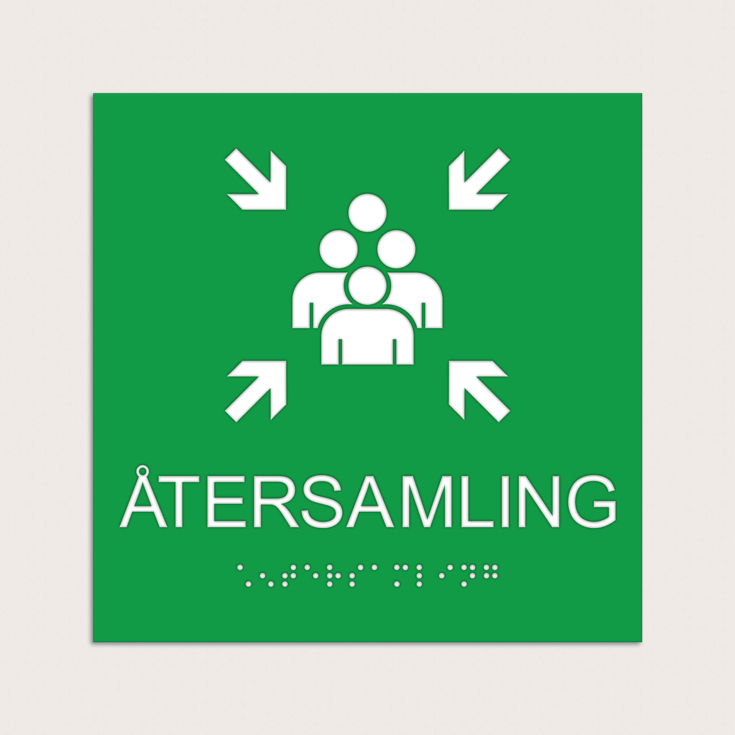 Ett taktilt piktogram med text och punktskrift till en Återsamlingsplats. Välj mellan olika färger och storlekar.