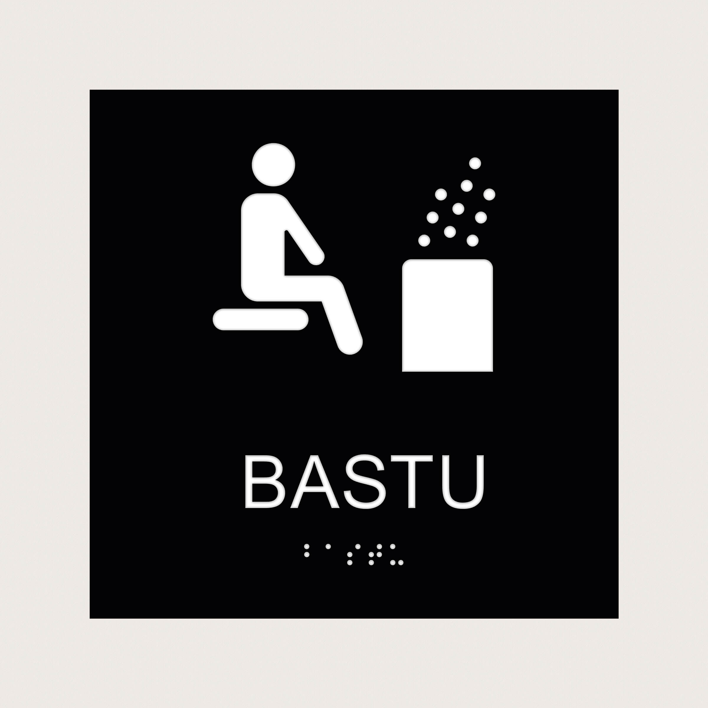 En tydlig och enkel taktil skylt att sätta utanför en bastu. SundaHus logga