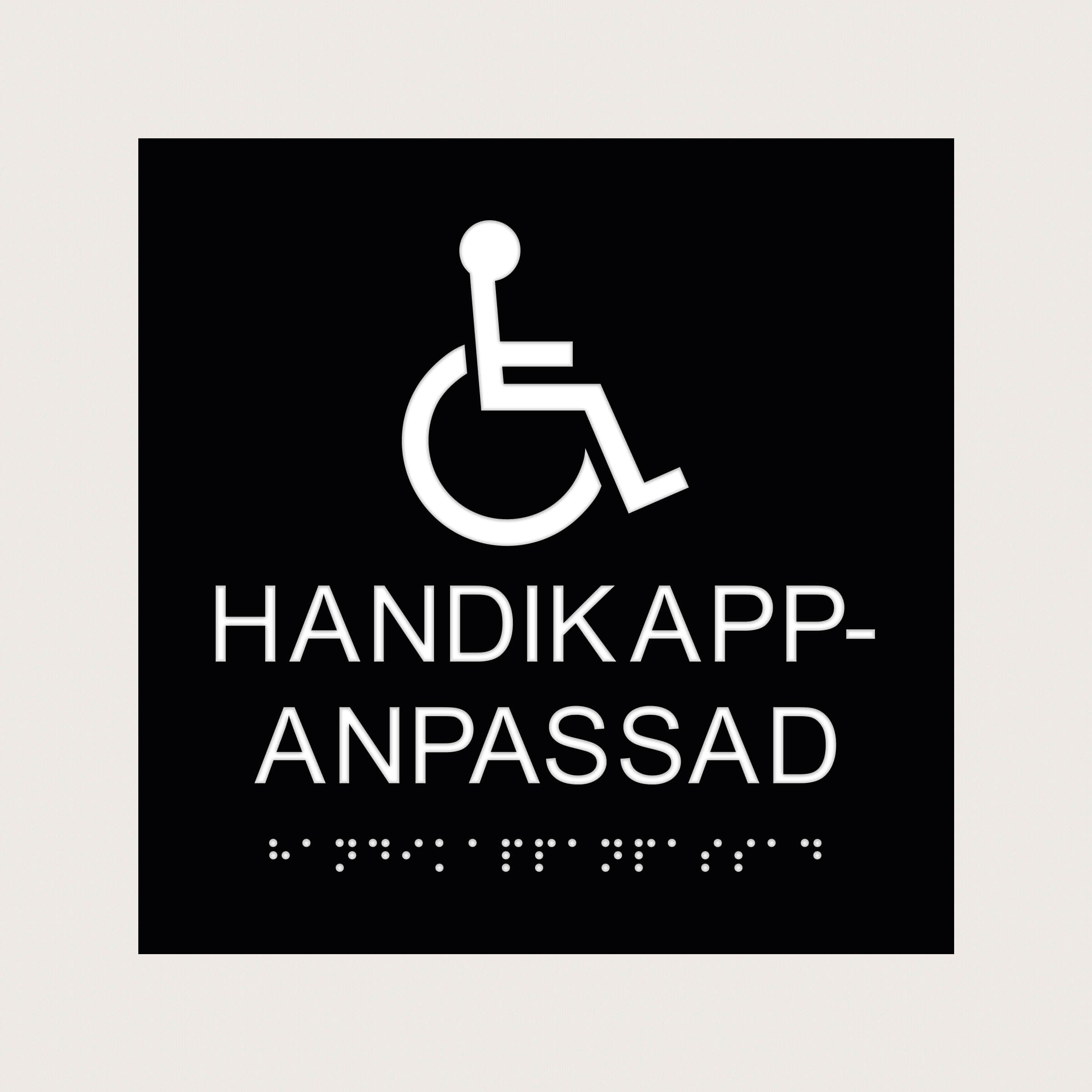Våra Taktila Piktogram är tillverkade i en ljusabsorberande och icke reflekterande akrylplast, speciellt framtaget för att optimera läsbarheten. Materialet uppfyller Myndigheten för Delaktighet (MFD) krav gällande tillgänglighetsanpassning. När vi tar fram taktila skyltar förhåller vi oss till standarder för tillgänglighetsanpassning (ADA) där det bland annat beskrivs hur tecken och symboler ska vara utformade för att på bästa sätt möjliggöra tillgänglighet för alla.
