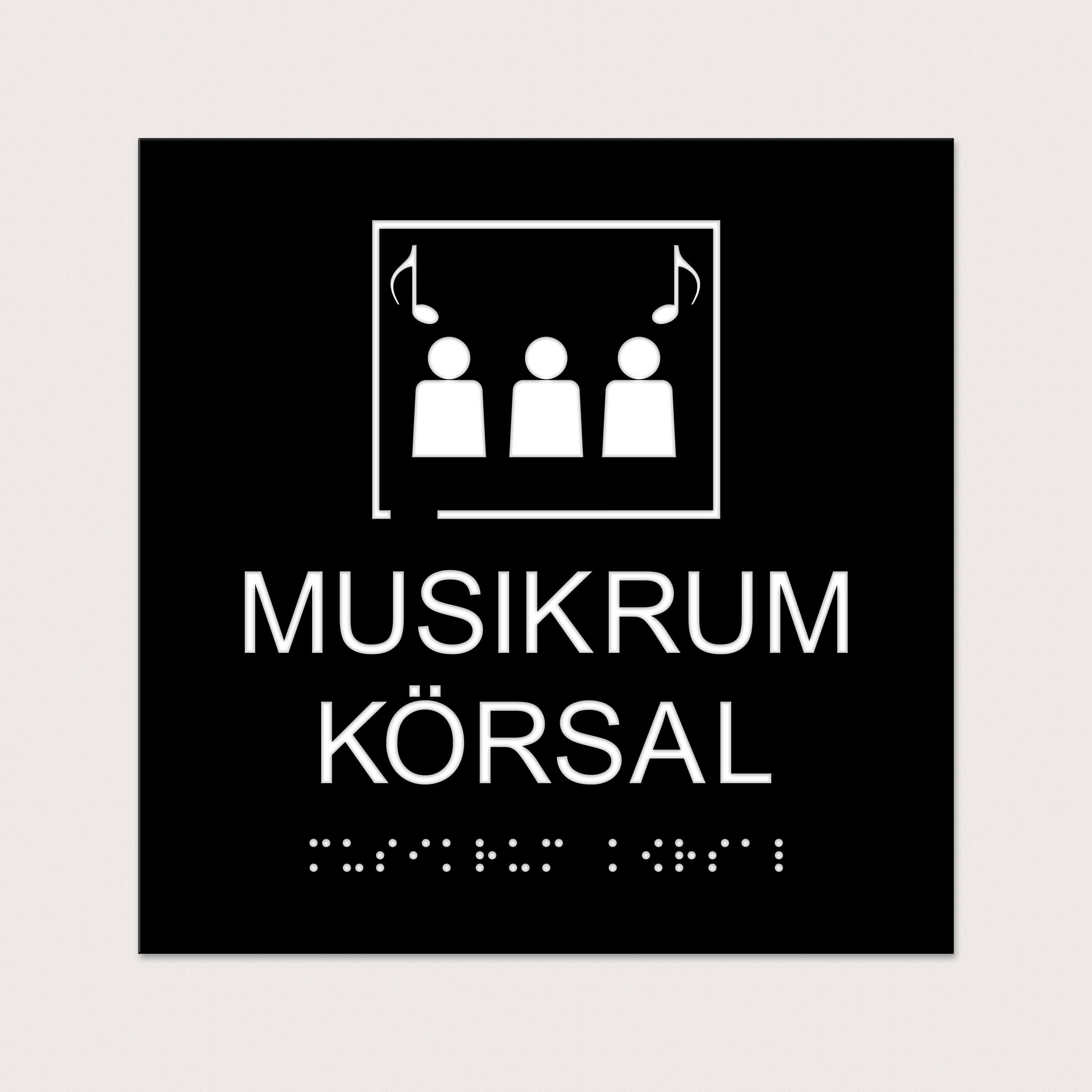 Taktilt piktogram med text Musikrum/Körsal. SundaHus logga