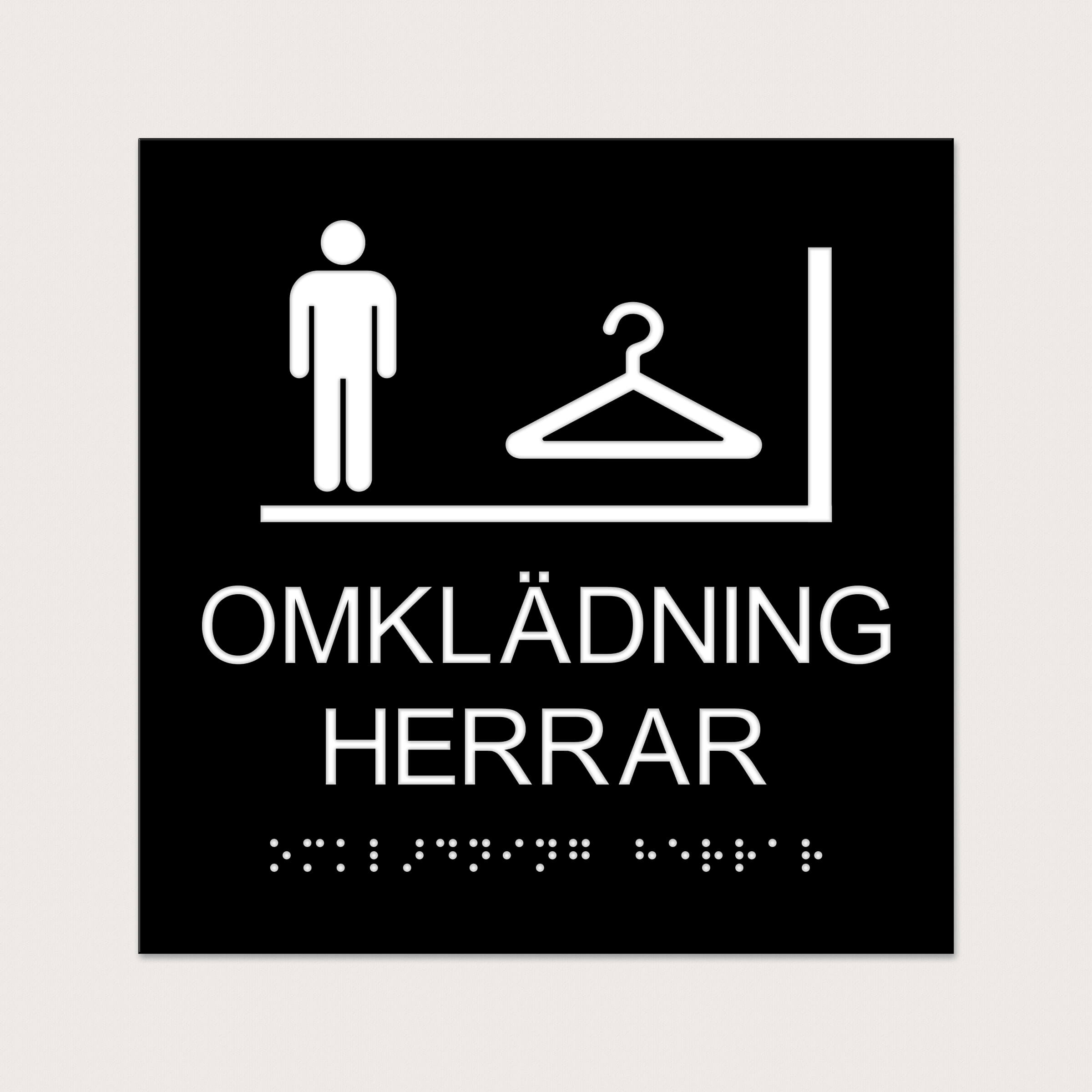 Ett taktilt piktogram med text att ha vid Herrarnas Omklädningsrum. Välj mellan olika färger.