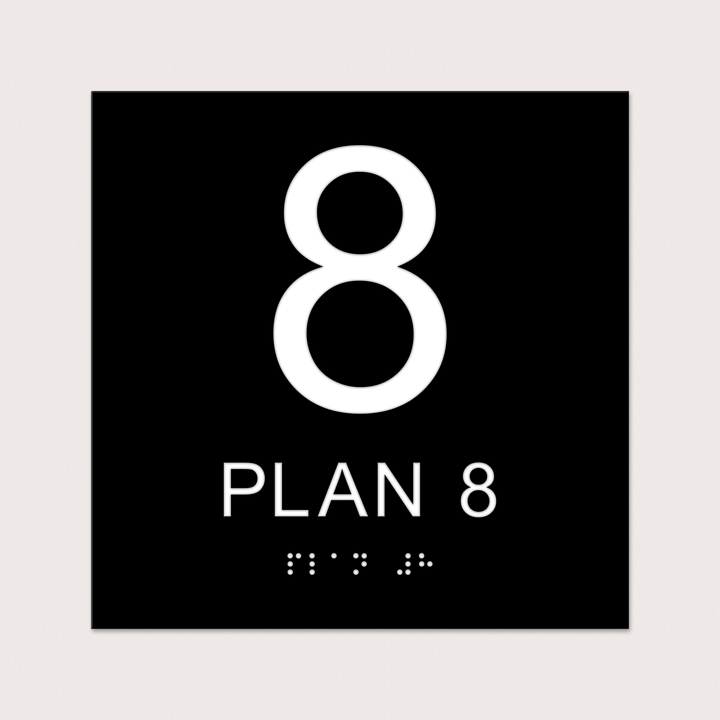Ett taktilt piktogram för Plan 8 som man kan fästa vid en trappa eller hiss. Välj mellan olika färger och storlekar.