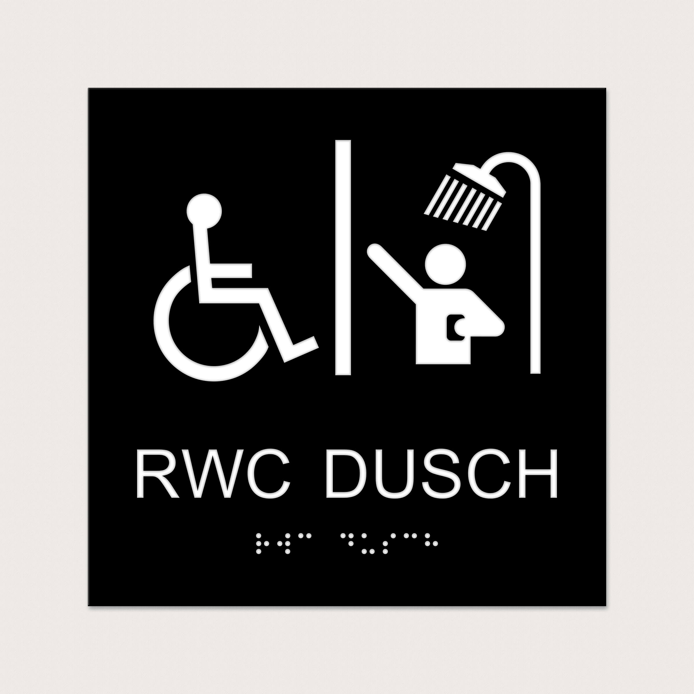 Ett taktilt piktogram att sätta utanför en toalett/dusch som är rullstolsanpassad. Välj mellan olika färger och storlekar.