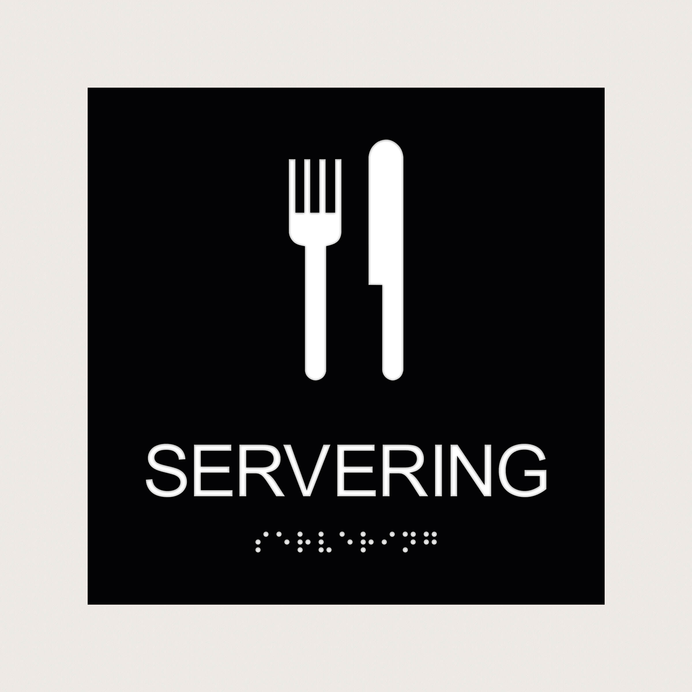 Ett taktilt piktogram med text och punktskrift till ett rum för Servering. Välj mellan olika färger och storlekar.