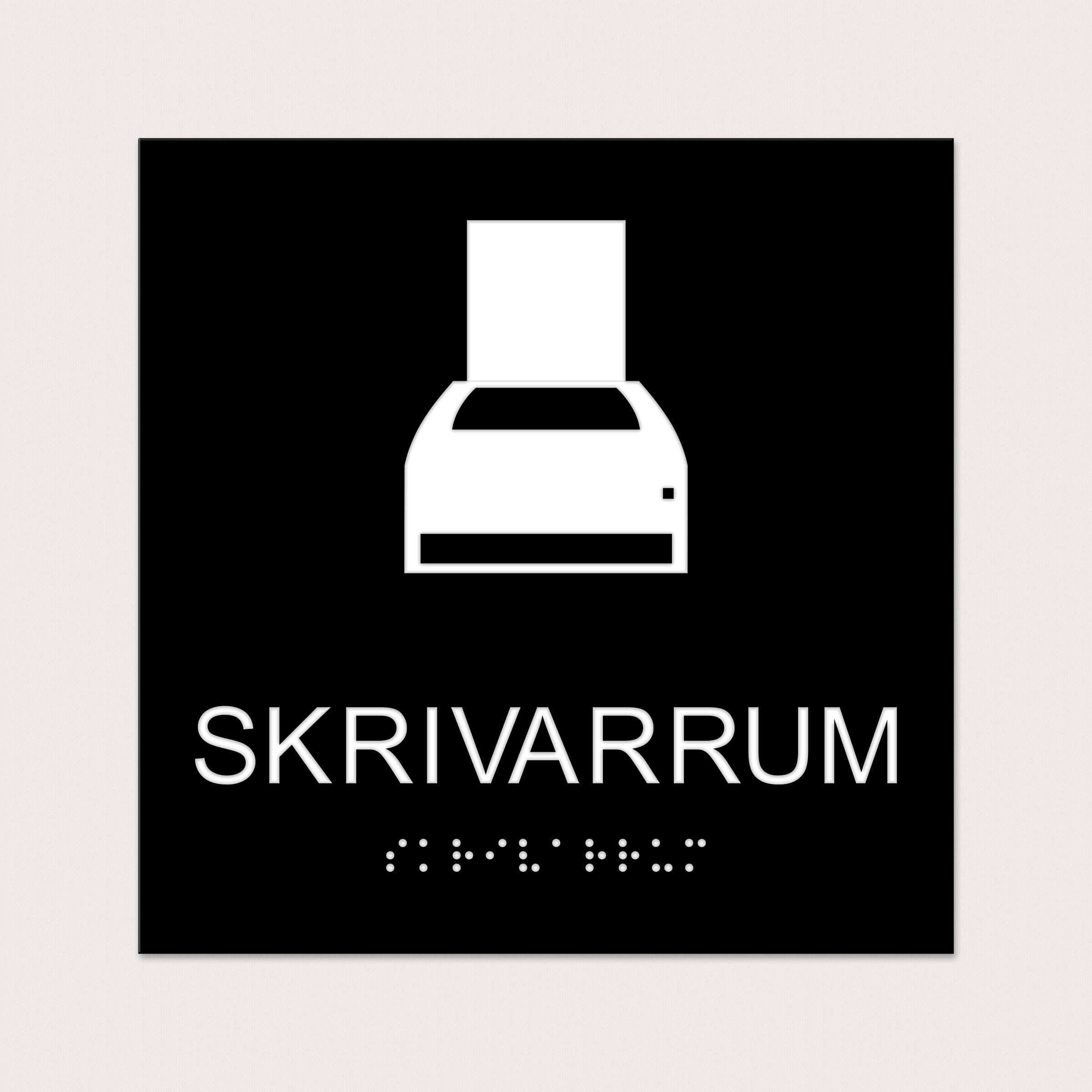 Ett taktilt piktogram med text och punktskrift att ha vid ett skrivarrum. Välj mellan olika färger och storlekar.