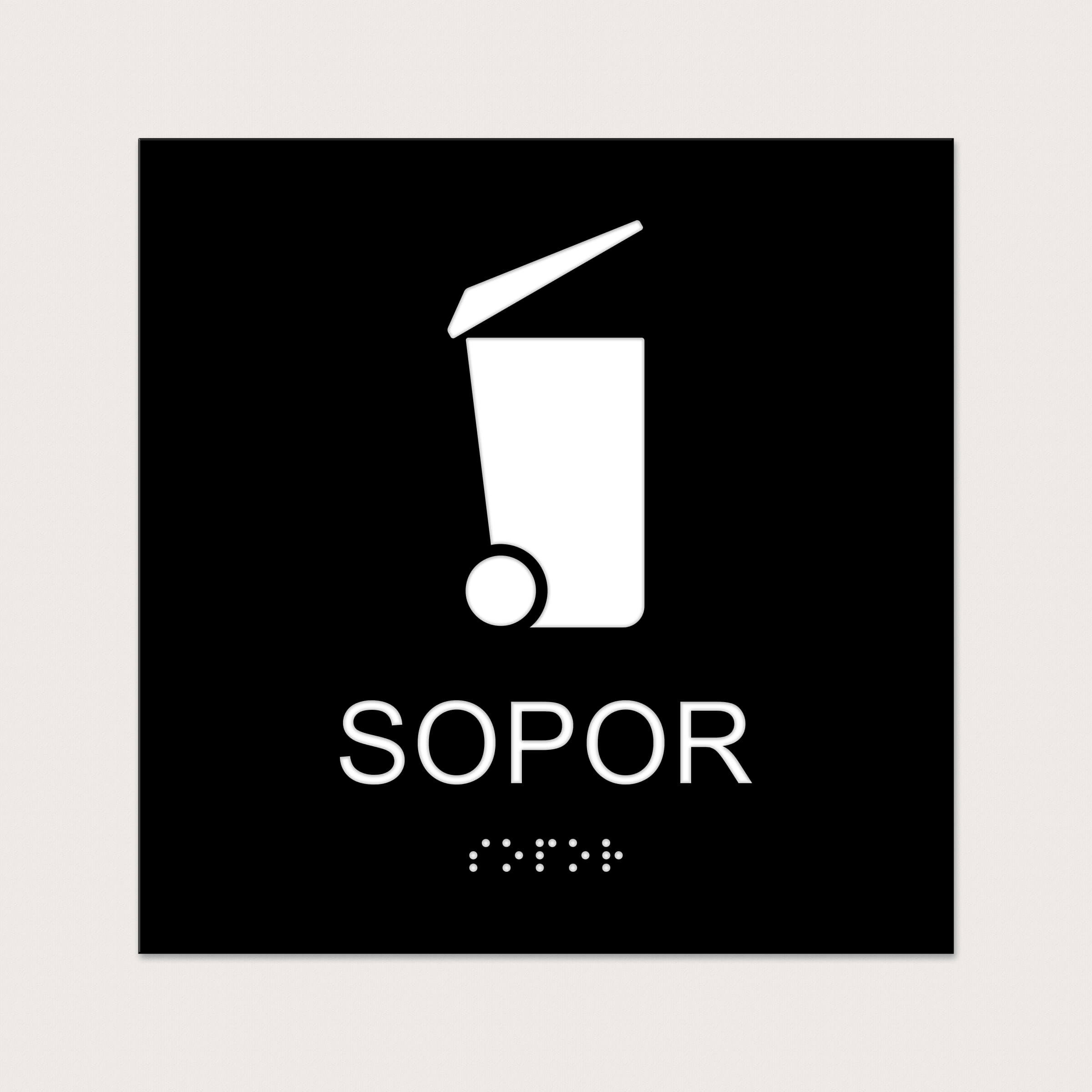 Ett Taktilt Piktogram som man kan ha vid fristående sopkärl eller soprum vid t ex ett ålderdomshem, förskola, skola och sjukhus.
