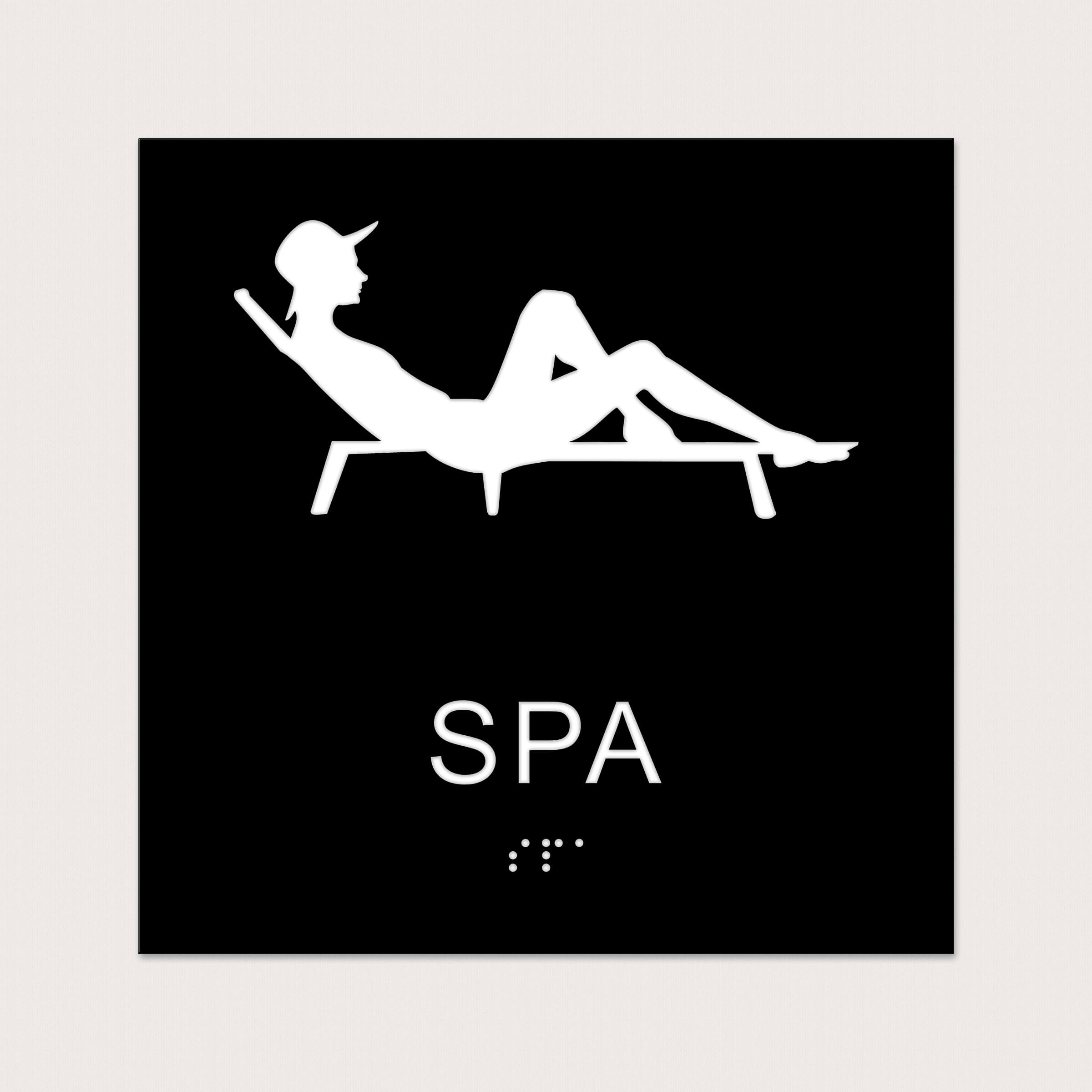 Ett taktilt piktogram med text och punktskrift vid ingången till ett spa. Välj mellan olika färger och storlekar.