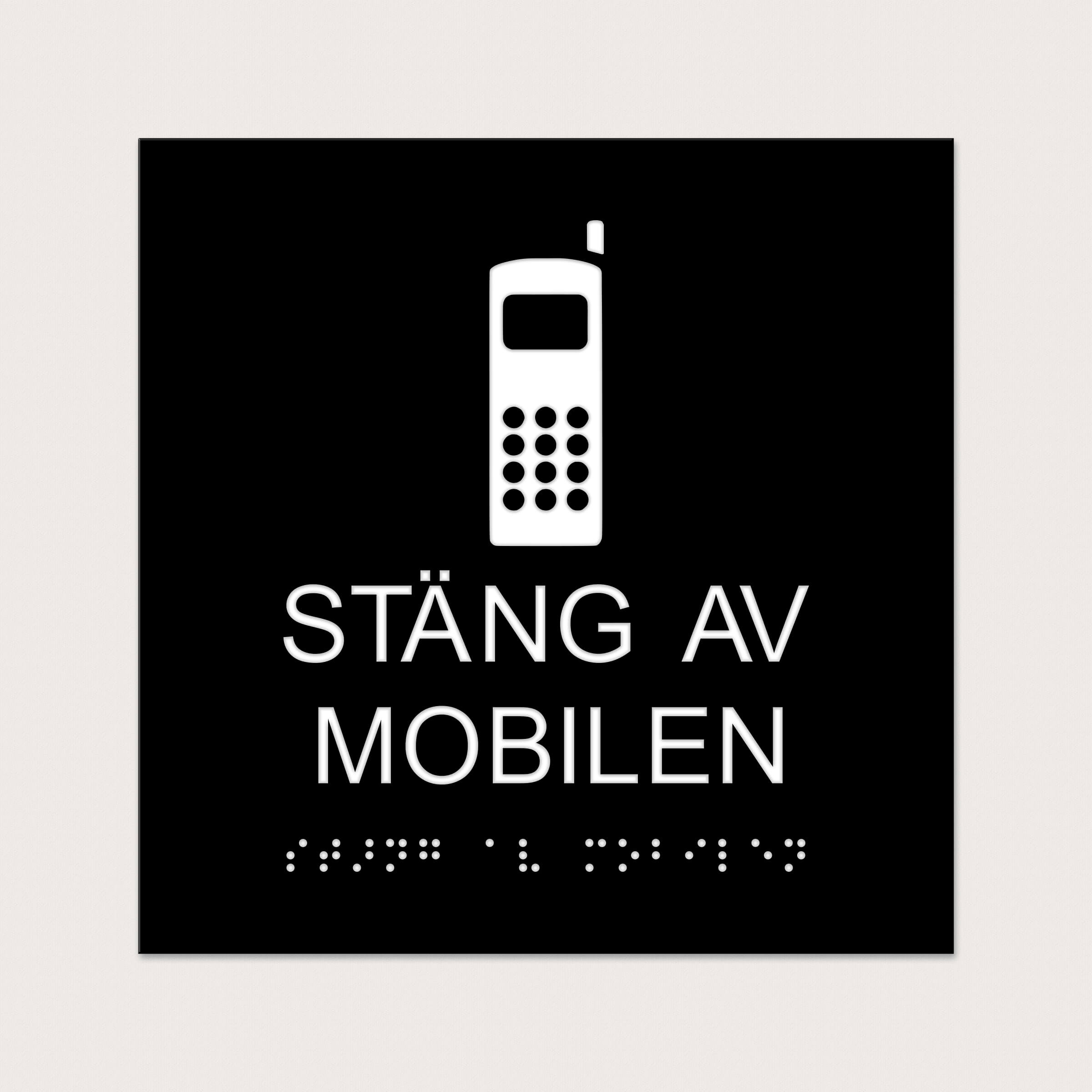 Ett taktilt piktogram med text och punktskrift som uppmanar besökaren att stänga av mobilen. Välj mellan olika färger.