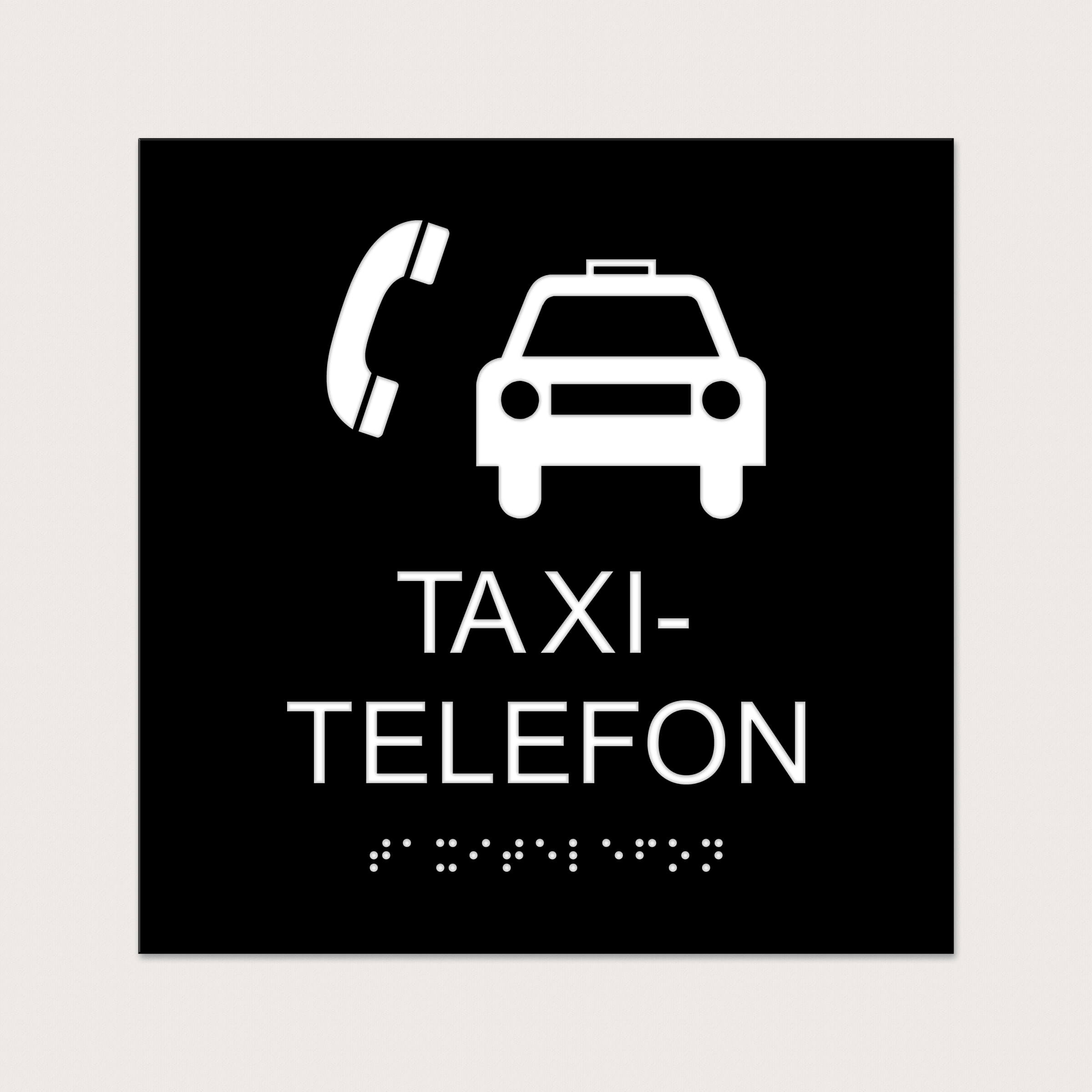 En taxiskylt med taktil text och punktskrift som visar att det finns en Taxitelefon. Välj mellan olika färger och storlekar.