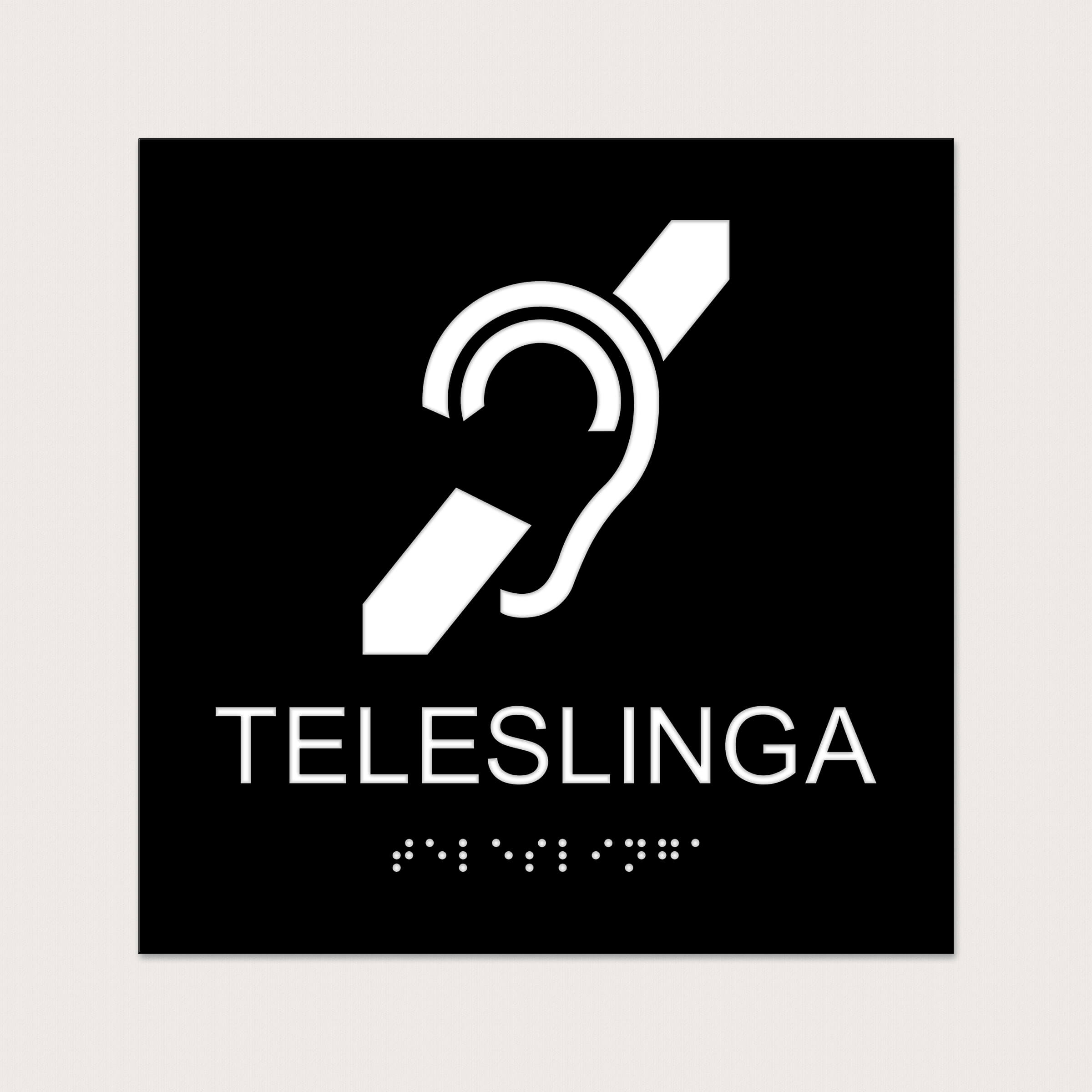 Ett taktilt piktogram med text och punktskrift om visar att det finns en teleslinga. Välj mellan olika färger.
