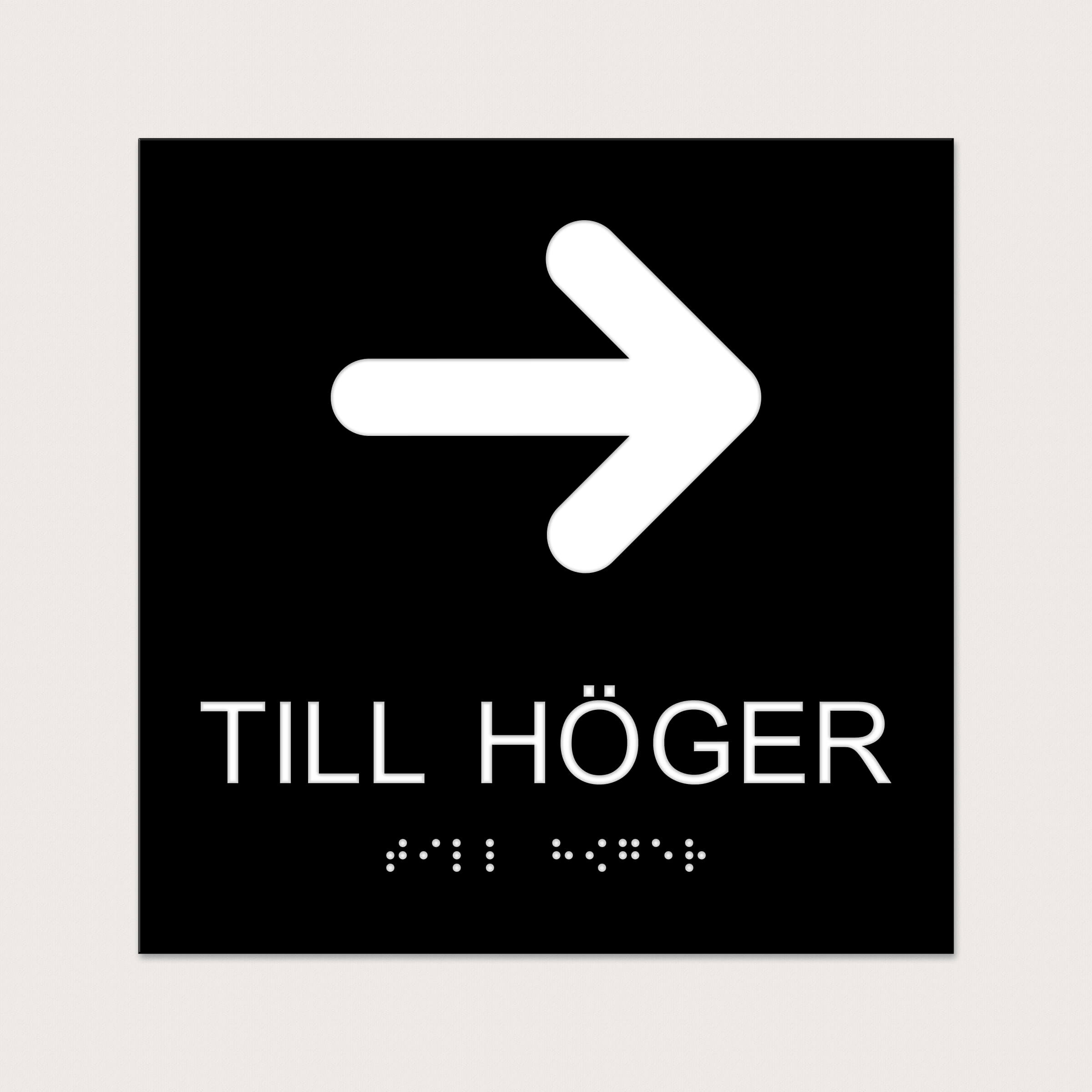 Ett taktilt piktogram med text och punktskrift som pekar åt höger. Välj mellan olika färger och storlekar.