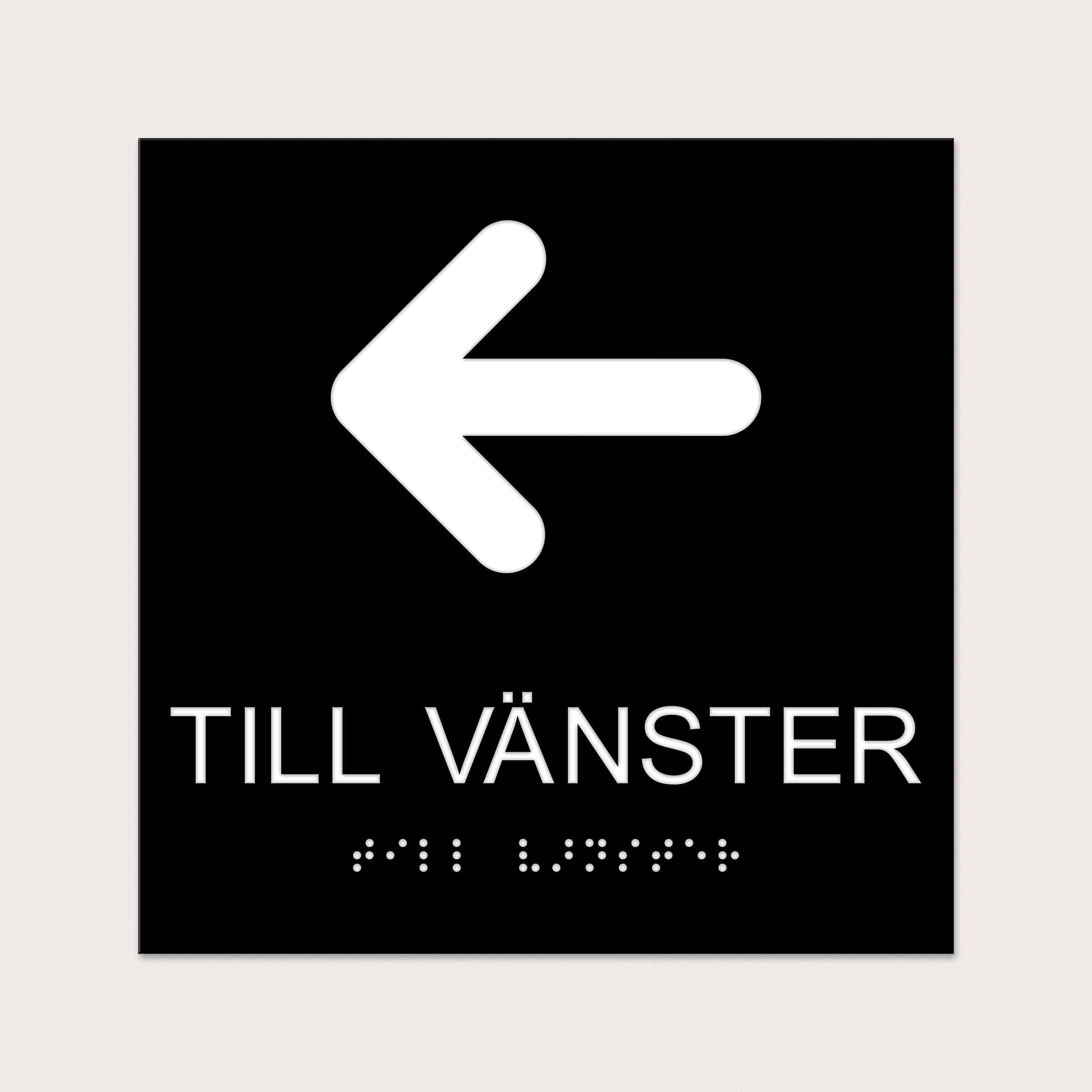 Ett taktilt piktogram med text och punktskrift som pekar till vänster. Välj mellan olika färger och storlekar.