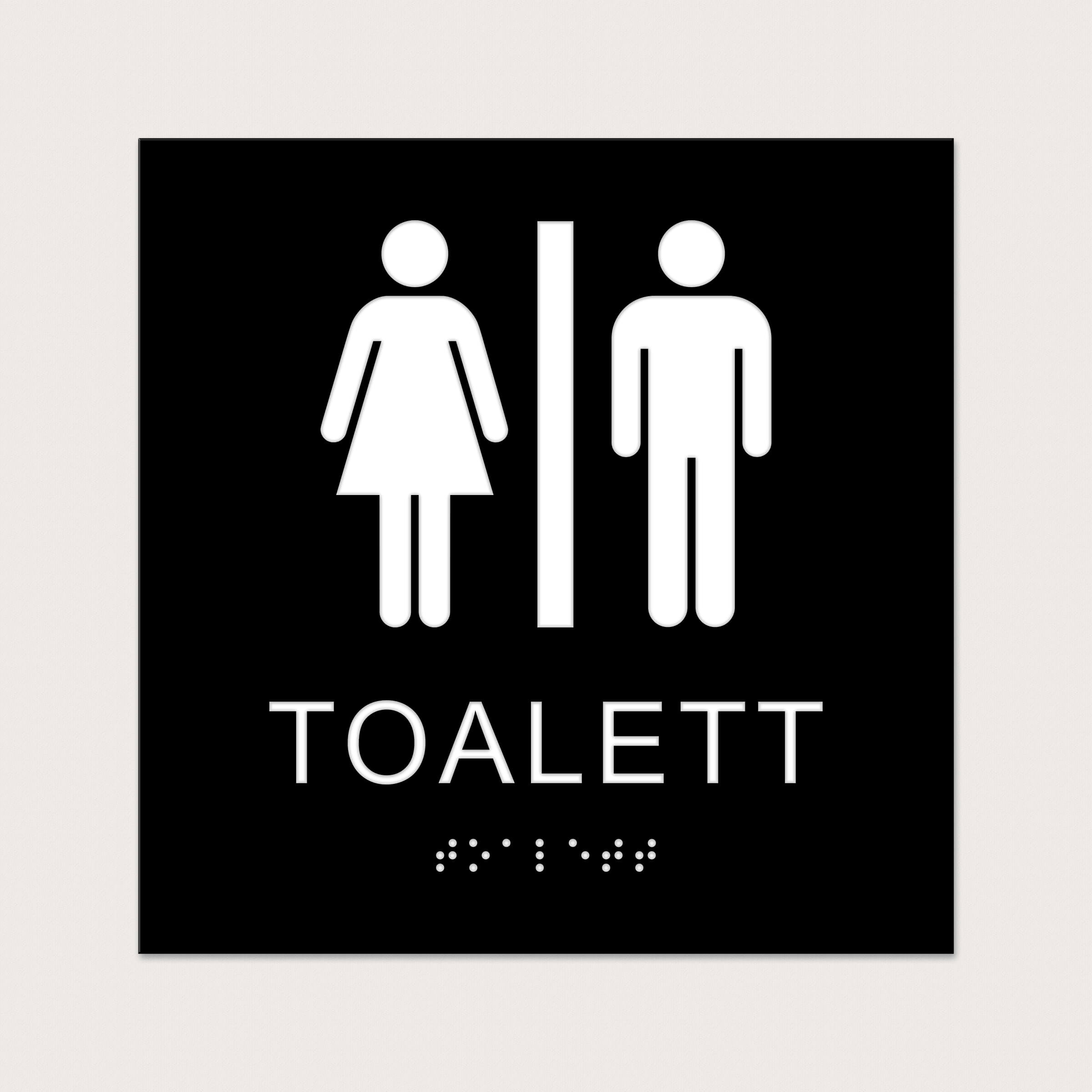 Ett taktilt piktogram med text och punktskrift för en Toalett.