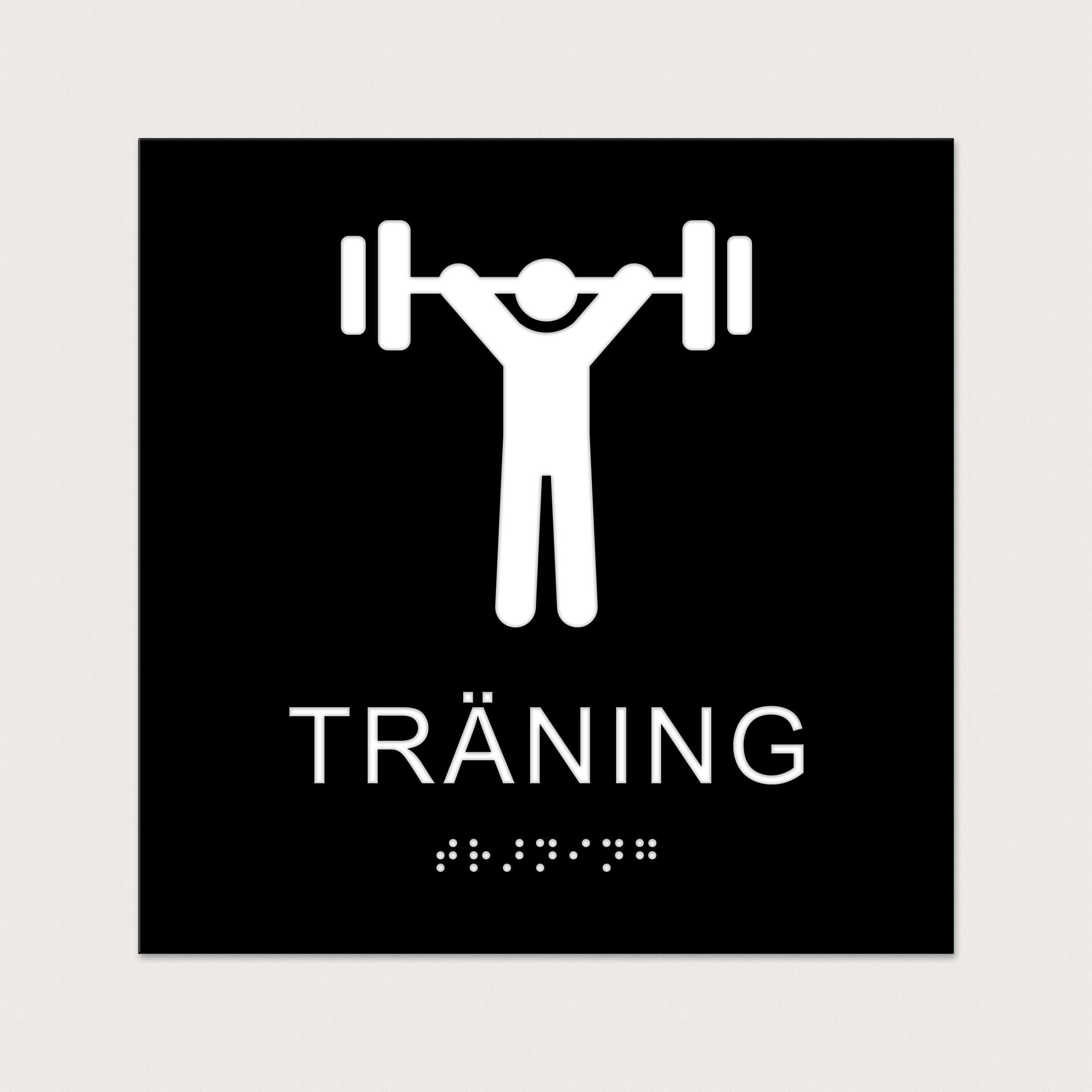 Ett taktilt piktogram med text och punktskrift. Skylten visar att rummet kan används för träning. Välj mellan olika färger.