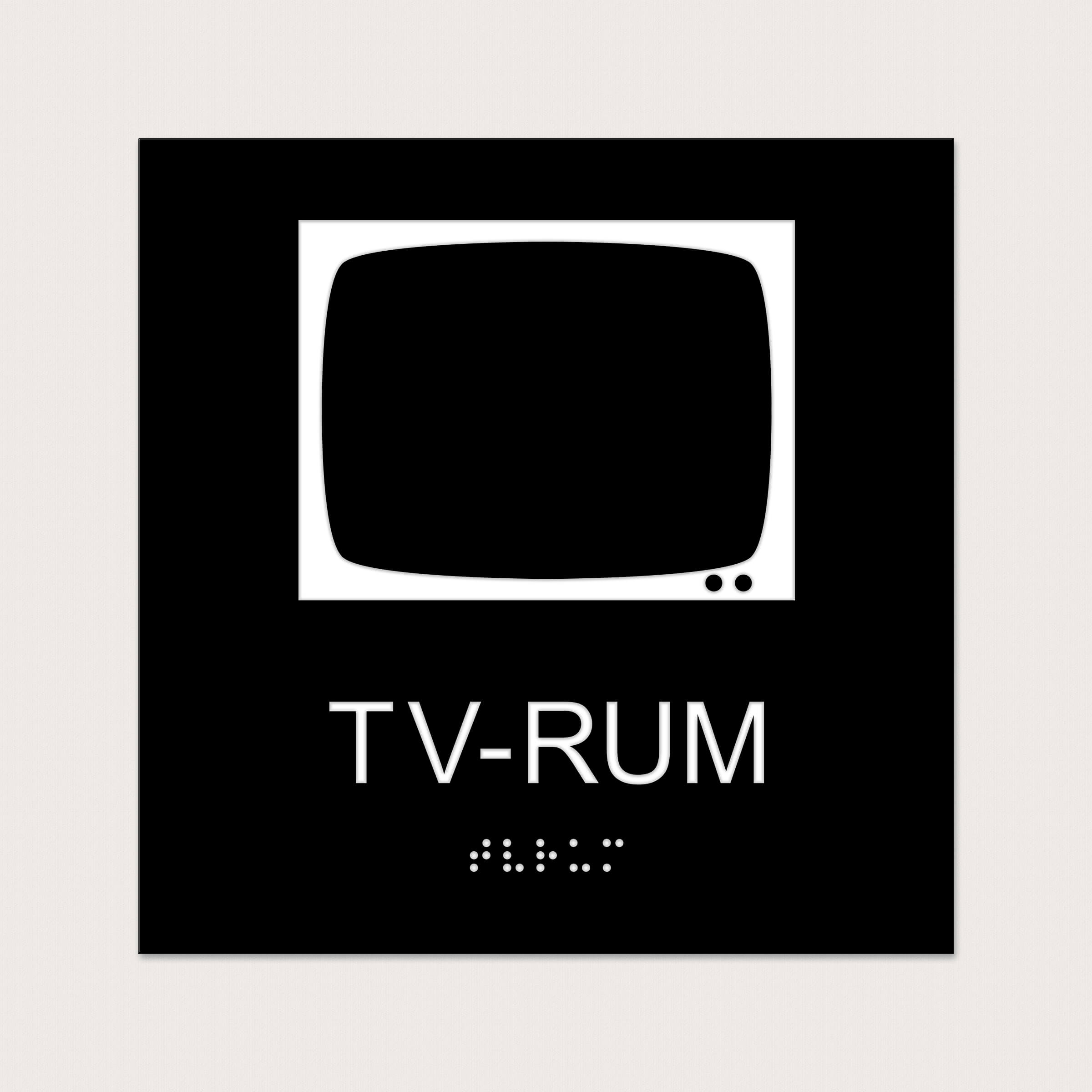 Ett taktilt piktogram med text och punktskrift som visar ett rum som har en tv. Välj mellan olika färger. SundaHus logga