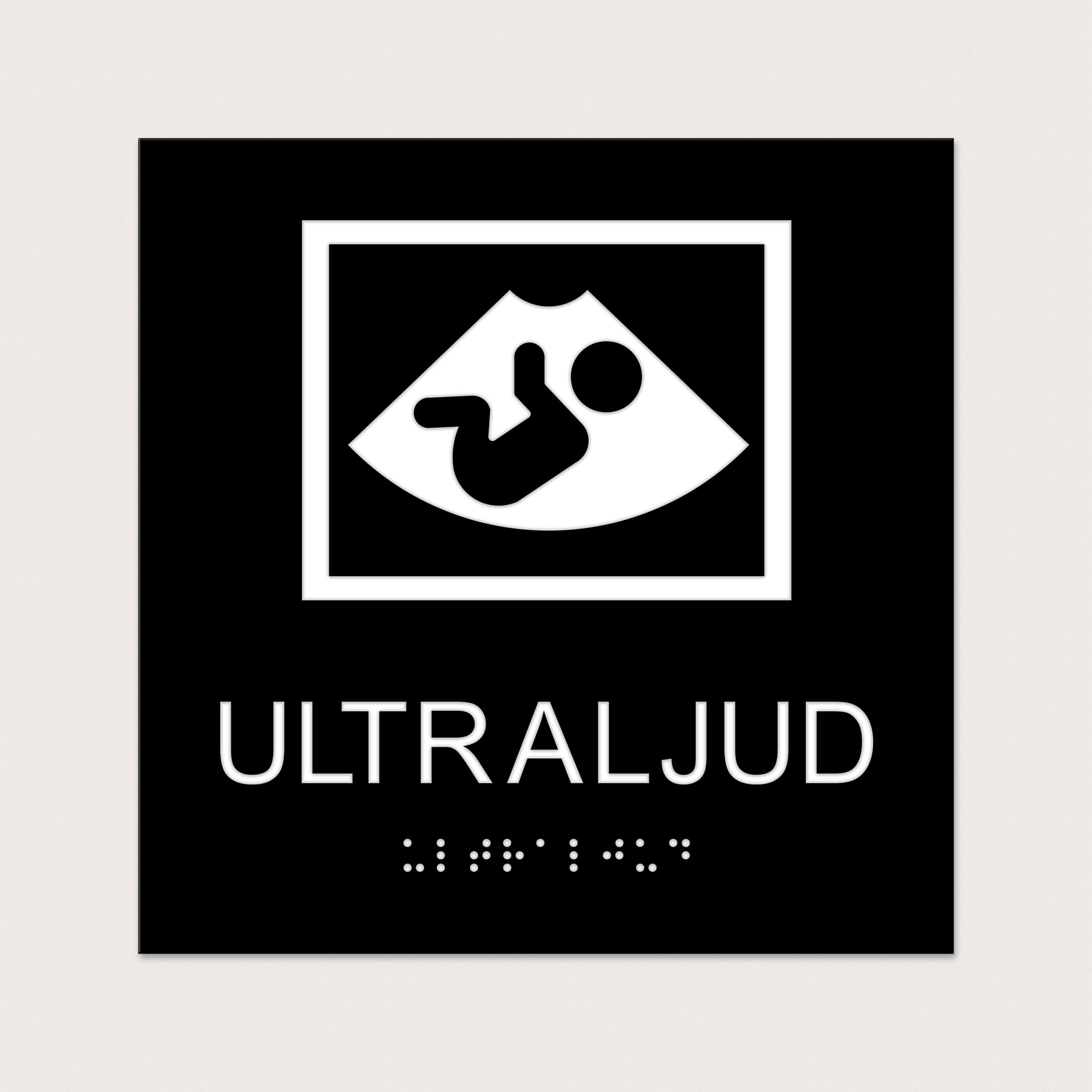 Ett taktilt piktogram med text och punktskrift till ett rum där man tar Ultraljud. Välj mellan olika färger och storlekar.