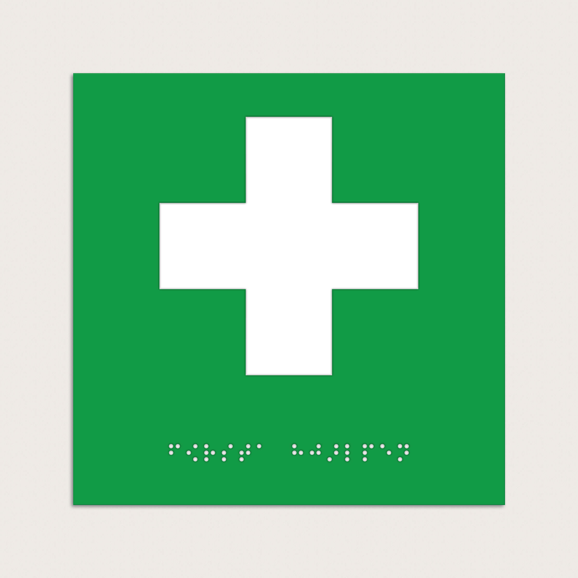 En taktil Första hjälpen skylt att sätta vid sin första hjälpen-utrustning som markerar den och gör den mer synlig.
