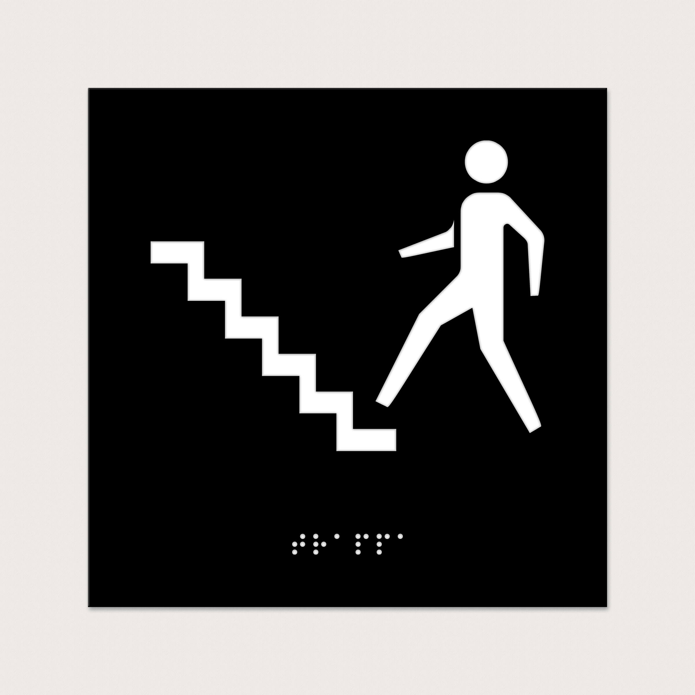 En taktil skylt med symbol och punktskrift att sätta vid trappa i en skola, lägenhetsbyggnad, köpcentrum eller sjukhus.