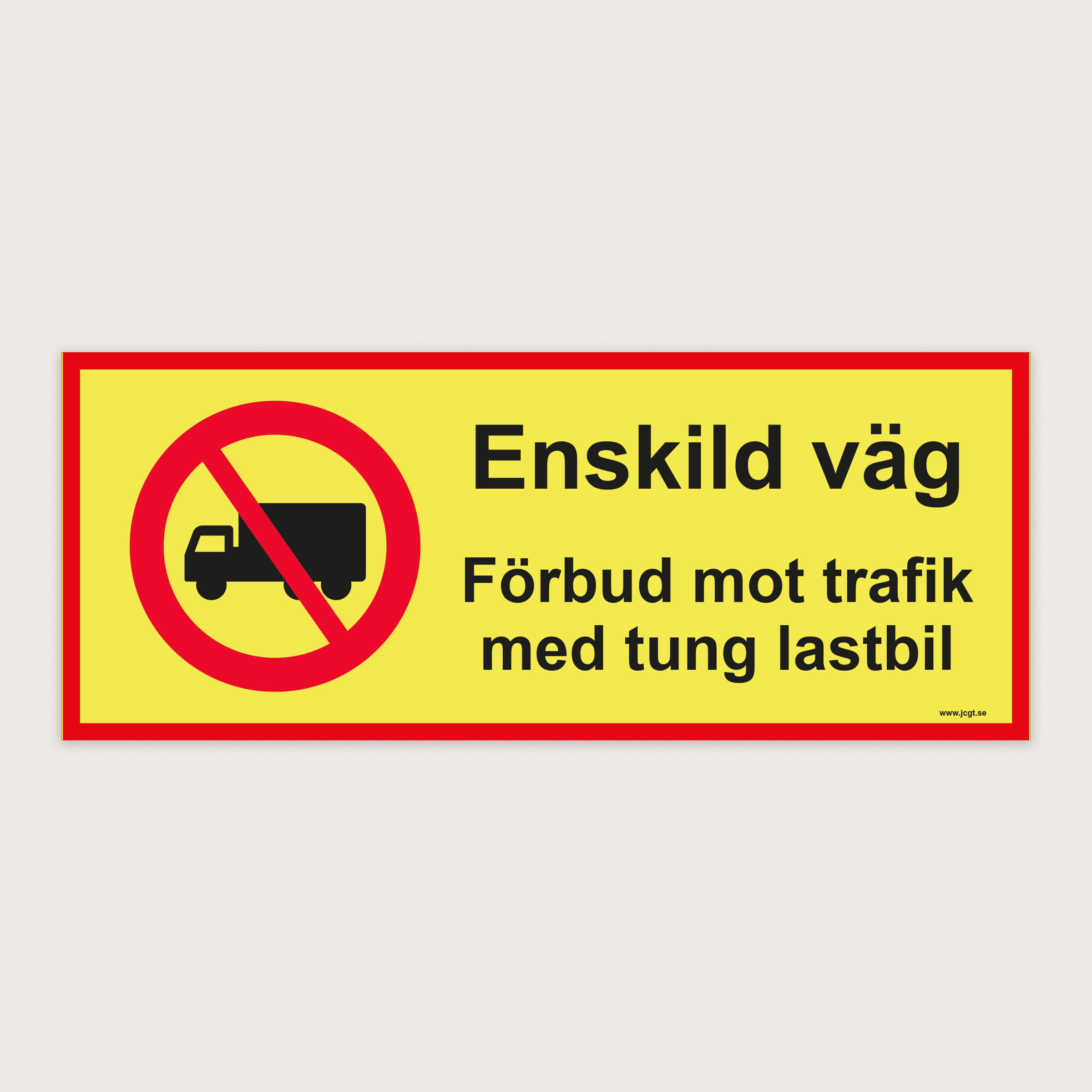 En Enskild väg Lastbilsförbud skylt att sätta vid sin enskilda väg. Ägaren av en enskild väg har rätt att förbjuda motortrafik och denna skylt passar bra om det är just lastbilstrafik som skall förbjudas. Med en vedertagen vägsymbol för lastbilsförbud och texten Förbud mot trafik med tung lastbil, så visar ni tydligt detta.