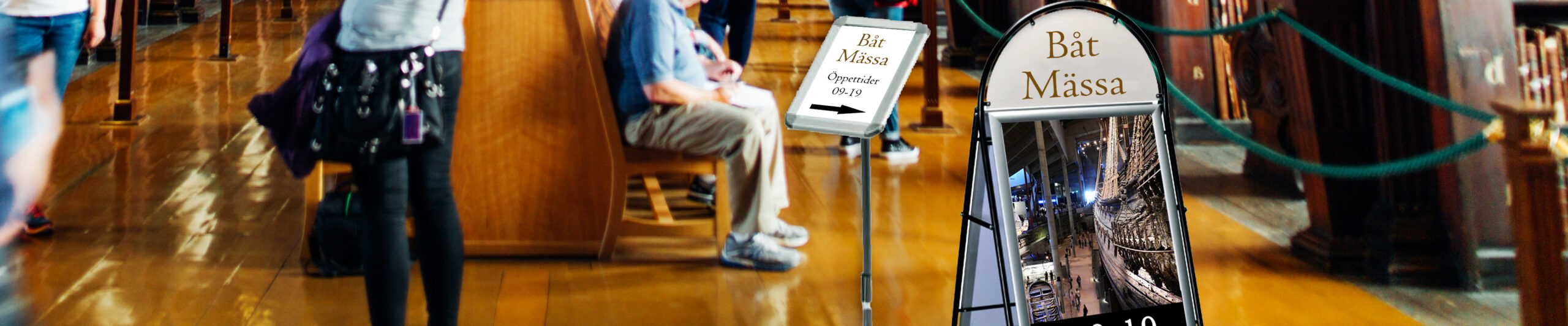 Vid en mässa är det ofta ett högt tempo, många människor på en liten yta som kan vara era potentiella kunder. Då vill ni ju sticka ut från mängden och väcka besökarens uppmärksamhet. Vi erbjuder ett snyggt och portabelt mässmaterial / mässutrustning som är enkla att ta med och ställa på plats. Dessa produkter går även lika bra att använda på plats i företaget eller i er butik.